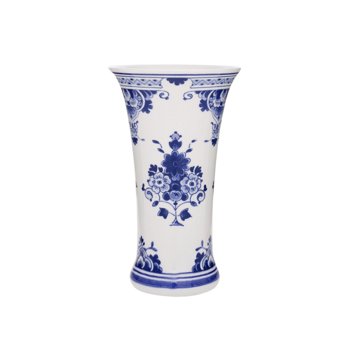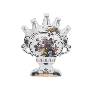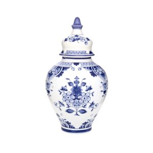 De verschillende Delfts Blauwe kleuren geven deze prachtige vaas extra diepte. De tekening is afkomstig van een van onze meesterschilders en kenmerkt zich door het gevarieerde bloemdecor.