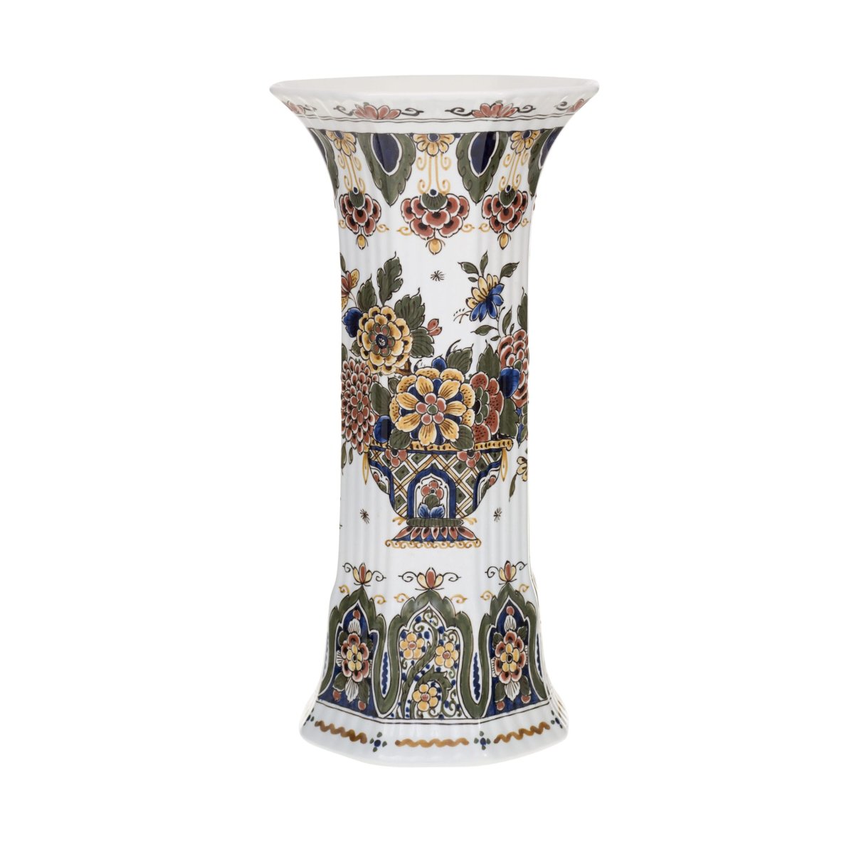 Naast het wereldberoemde Delfts Blauw creëren de meesterschilders van Royal Delft ook de veelkleurige polychrome collectie. Deze decoratiestijl is geïnspireerd op de kleuren die in het Middellandse-Zeegebied worden gebruikt en het zijn deze kleuren die het aardewerk zijn typische karakter geven. Deze polychrome vaas kan deel uitmaken van een kaststel. In de jaren dertig van de achttiende eeuw werden in Delft maar liefst tien typen gelanceerd. Volgens de mode van die tijd werden kaststellen op de overstekende kap van een kast geplaatst. Deze grote vaas met rijk versierde bloemmotieven heeft de tand des tijds doorstaan.