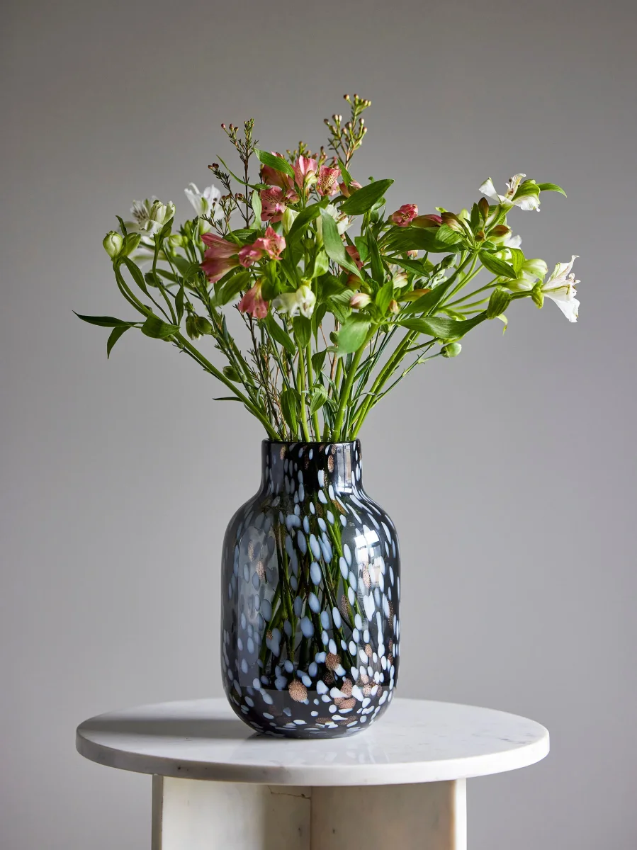 De Gwan Vase van Bloomingville is een prachtige, mondgeblazen vaas in grijs geverfd glas, met een bijzonder patroon van stippen in een uitgerekte look. De vaas heeft de perfecte vorm voor een groot boeket verse of gedroogde bloemen. Zonder bloemen is de vaas ook een zeer decoratief stuk dat voor een persoonlijk tintje in huis zorgt. De mondgeblazen techniek kan luchtbellen en kleurvariaties achterlaten, als onderdeel van de bedel.