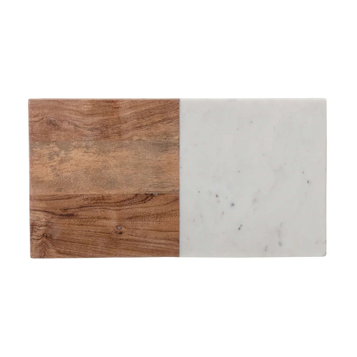 De Gya Cutting Board van Bloomingville is een originele rechthoekige plank gemaakt van een mix van wit marmer en acaciahout. Op dit elegante display zien je snacks er heerlijk uit.