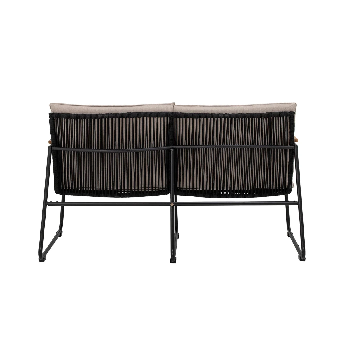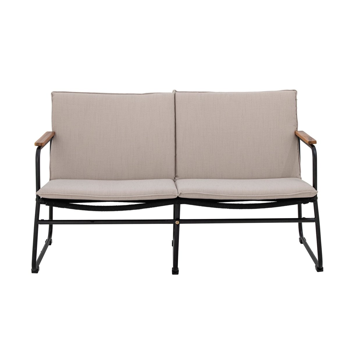 De Hampton Sofa van Bloomingville is goed voor de zomer en is geschikt voor een klein terras of een kleine oppervlakte. Het bankframe is van zwart metaal, terwijl de zitting en rugleuning van gevlochten koord zijn en samen met de kussens is het heerlijk zitten. By burg: vuil kun je er met lauw water en zeep afwassen. De armleuning is bekleed met Acacia en voor onderhoud licht opschuren en herstellen met olie. Het wordt aanbevolen om de bank in een overdekte ruimte te plaatsen en buiten het seizoen niet binnenshuis op te slaan.