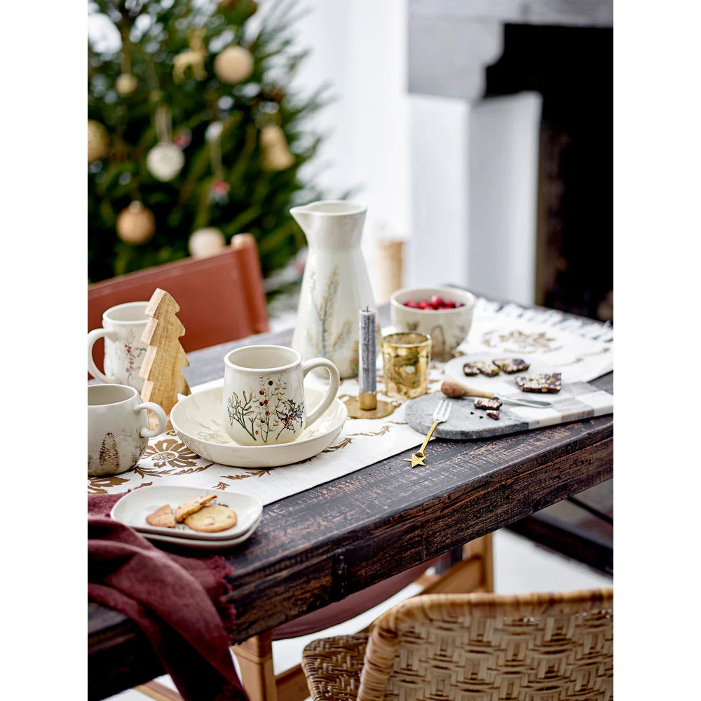De Hollie Jug van Bloomingville is een steengoed kan in natuurlijke kleuren met een delicaat kerstbloemmotief op het craqueléglazuur. Het zal elke kersttafel verlichten.