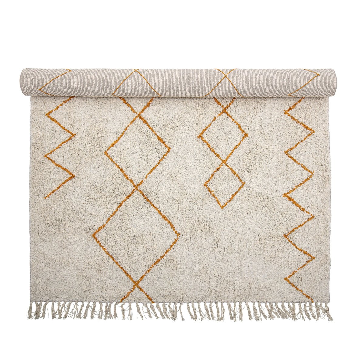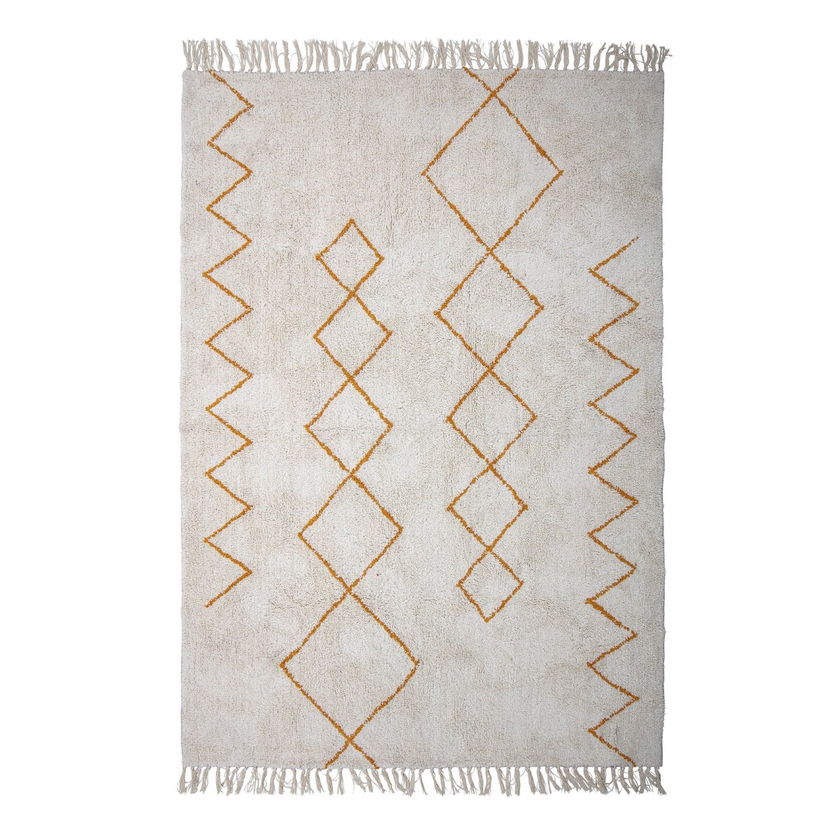 Het Huso Rug van Bloomingville is een geweven en natuurlijk garengeverfd vloerkleed met geometrische motieven in een warme gele kleur als mooi maar rustig detail. De kleine franjes aan elk uiteinde geven een extra gezellig tintje aan het ontwerp.