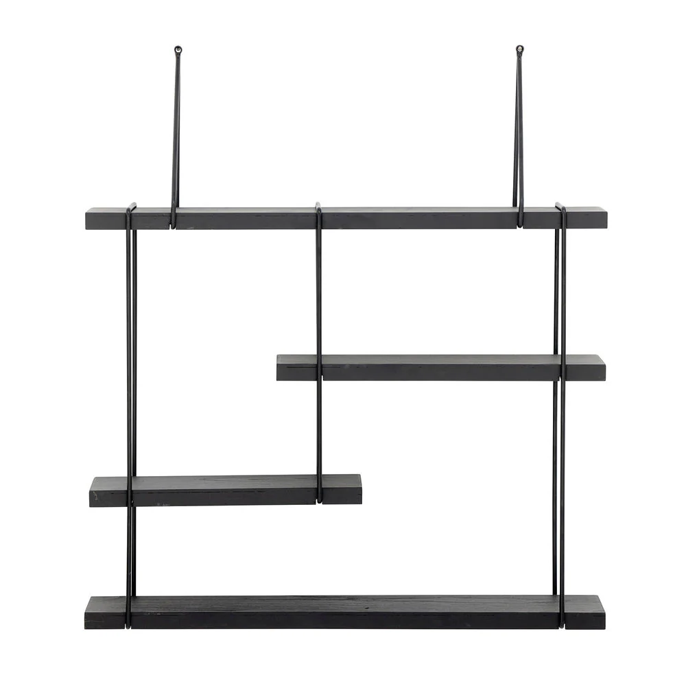 De Lewis Shelf van Bloomingville is gemaakt van zwart hout en heeft een ontwerp met asymmetrische planken. Dit maakt een creatieve organisatie en weergave van boeken, planten of andere decoratieve items mogelijk, wat bijdraagt aan de esthetiek van de kamer.