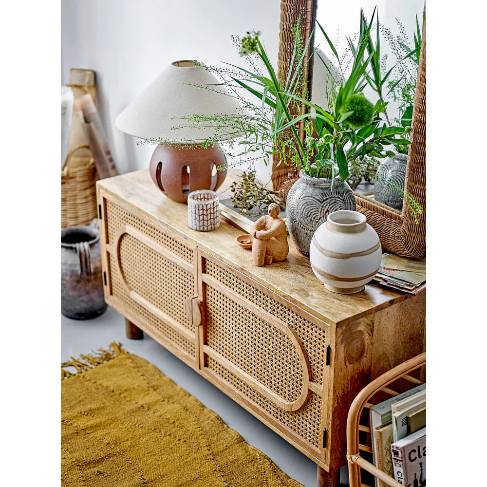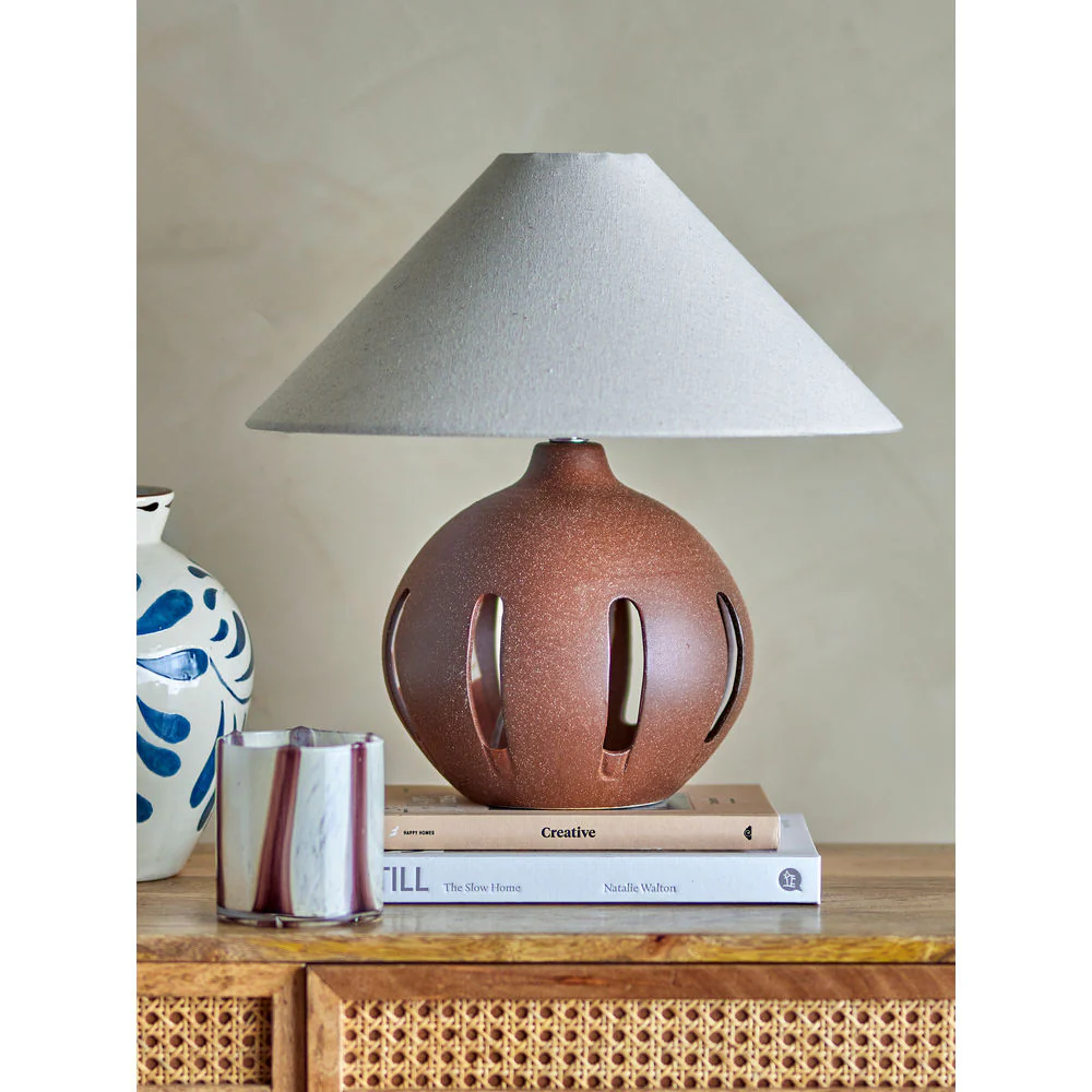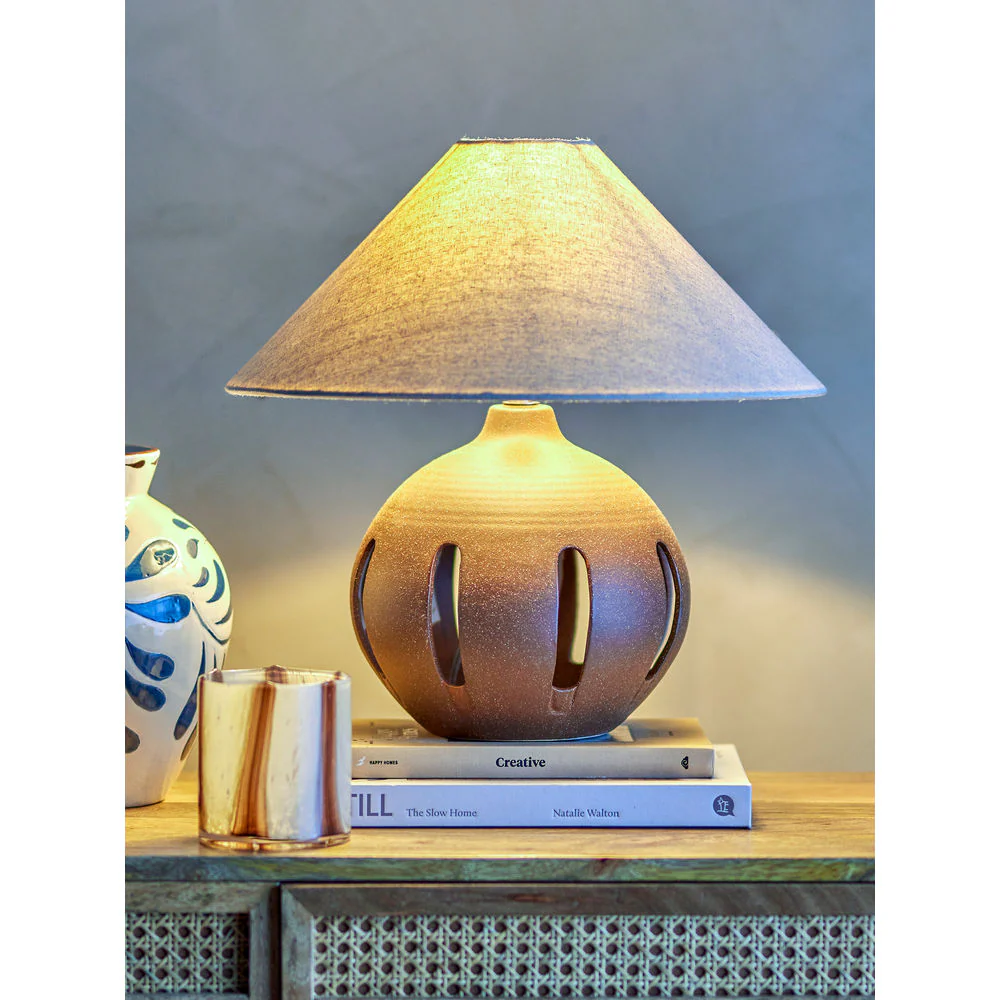 De Liana Tafellamp van Bloomingville zorgt voor een rustig en warm licht in de kamer. De lamp heeft een ronde steengoed voet in een prachtige bruine tint met een matte glazuur. De lichte linnen tint zorgt voor een mooi contrast met de donkerdere tint van de basis. Met zijn unieke ontwerp, voorzien van elegante sleuven, ziet de lamp er zowel licht als stijlvol uit en wordt hij een decoratieve toevoeging aan elke kamer.