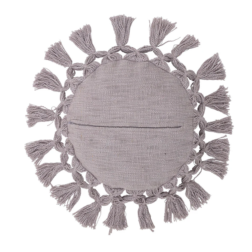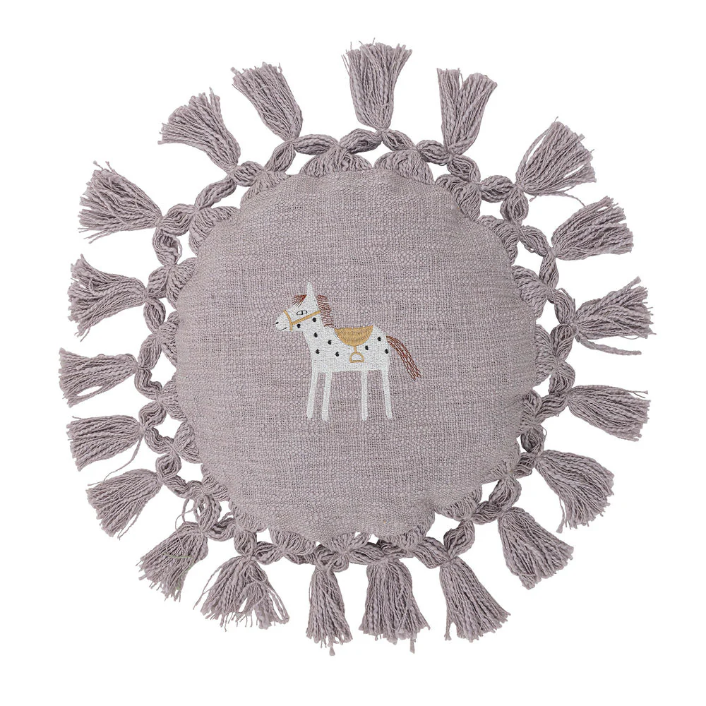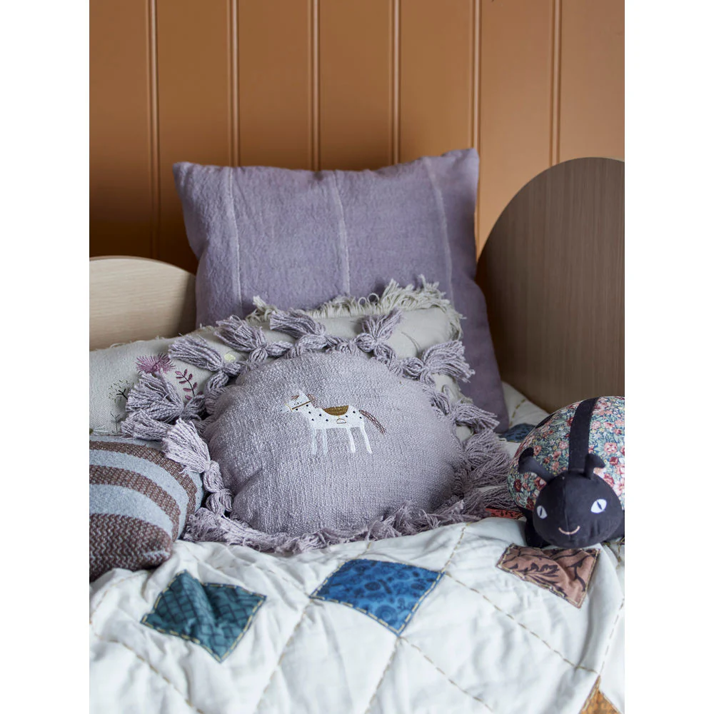 Het Elinna Kussen van Bloomingville MINI heeft een ronde vorm met grote kwastjes aan de rand. Het is gemaakt in een mooie paarse kleur met een klein paardje geborduurd. Het kussen is gemaakt van katoen en past mooi in de kinderkamer of een kas.