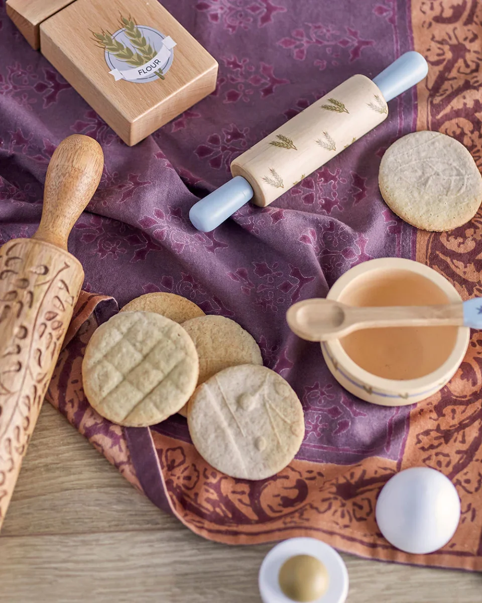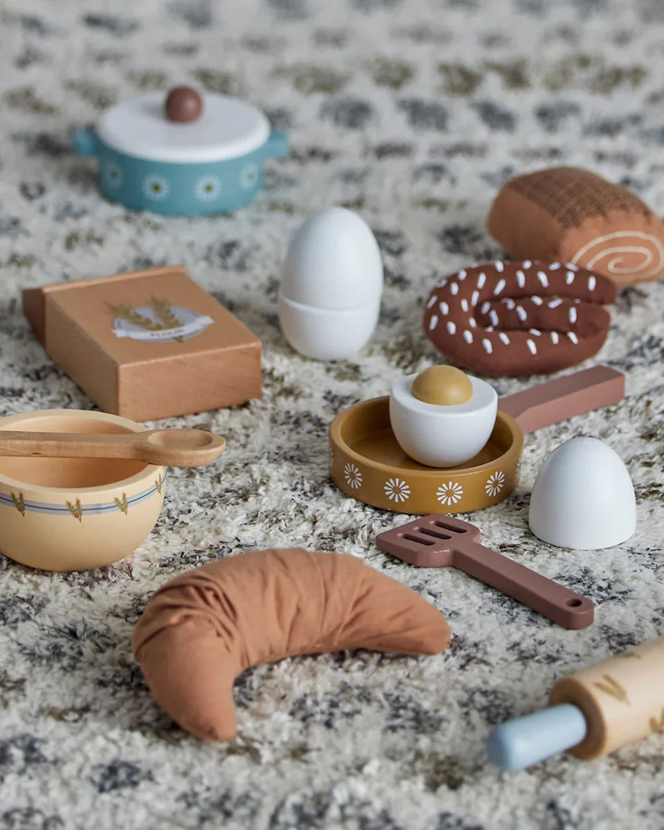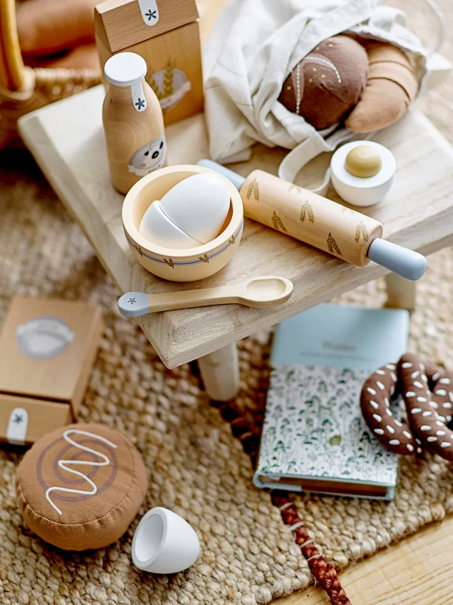 De Konrad Toy Food van Bloomingville MINI is een set van 8 items gemaakt van beukenhout en in leuke natuurkleuren. De bakset heeft meerdere functies. Meel- en suikerzakjes kunnen de bovenkant openen en eieren kunnen doormidden worden gesneden, wat uren speelplezier garandeert. Het past perfect bij de Bloomingville supermarkt die je in de collectie kunt vinden. Verpakt in een katoenen tas.