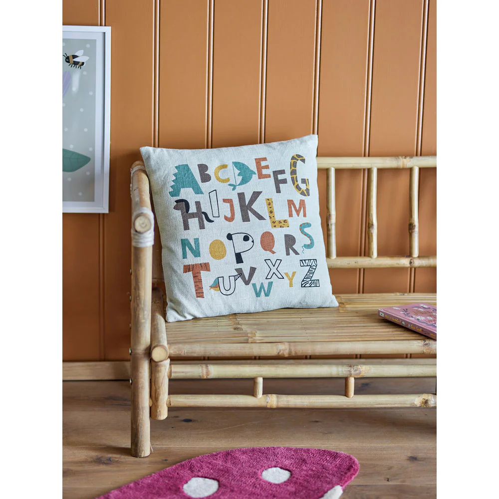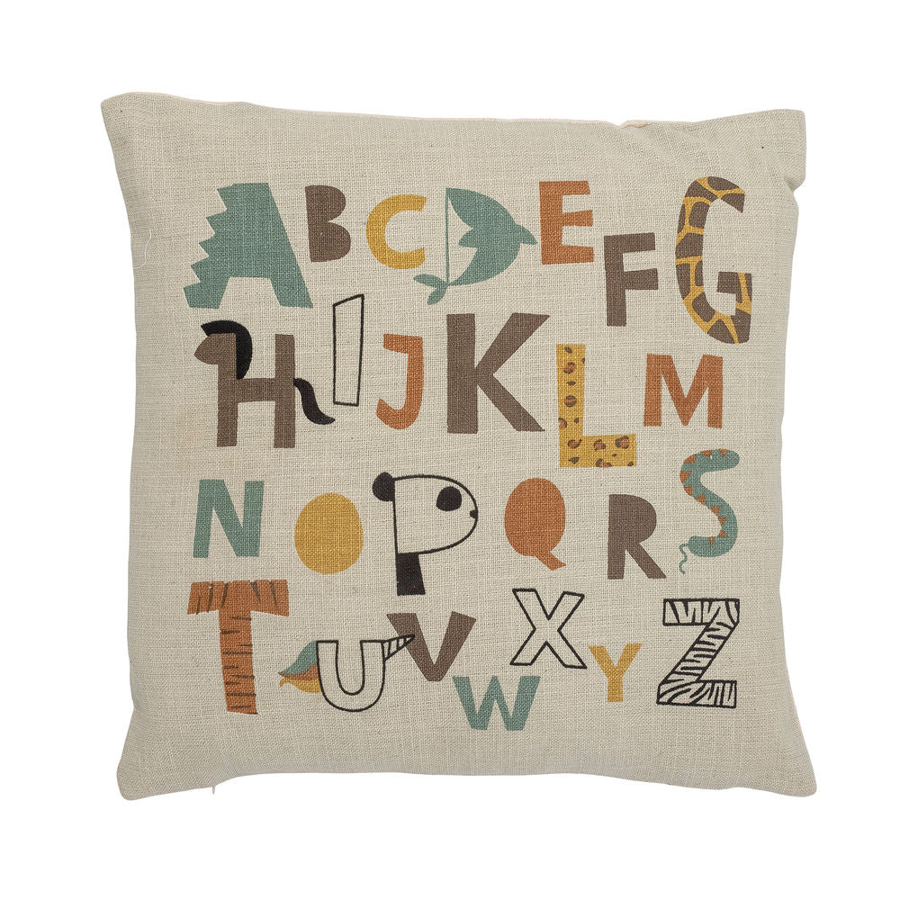 Het Memmo Kussen van Bloomingville MINI heeft een mooie print van letters in de vorm van grappige dieren, in zachte kleuren. Het kussen is zowel decoratief, gezellig als leerzaam: de perfecte combinatie.