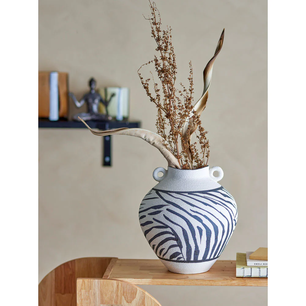 De Togo Vase van Bloomingville is een decoratieve vaas in een zachte vorm versierd met kleine handvatten. De vaas is prachtig met de hand beschilderd in een mat witte glazuur met een elegant zwart patroon. Ook zonder bloemen zeer decoratief. Omdat het met de hand beschilderd is, zal elke vaas variƫren en uniek zijn.