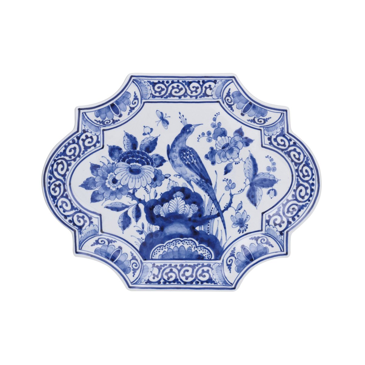 Op dit met de hand geschilderde Delfts Blauwe bord is de beroemde signatuur van Royal Delft, de paradijsvogel, te zien. De paradijsvogel is omlijst met diverse bloemen in Delfts Blauw. Ook de rand van het bord is door onze meesterschilder versierd met een grafische decoratie.