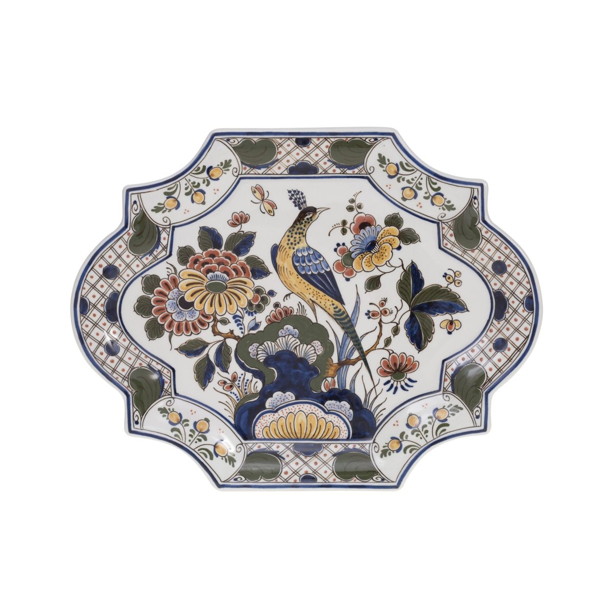 Naast het wereldberoemde Delfts Blauw creëren de meesterschilders van Royal Delft ook de veelkleurige polychrome collectie. Deze decoratiestijl is geïnspireerd op de kleuren die in het Middellandse-Zeegebied worden gebruikt en het zijn deze kleuren die het aardewerk zijn typische karakter geven. De rand van dit rechthoekige bord is bijna symmetrisch waardoor hij een modernere twist krijgt.