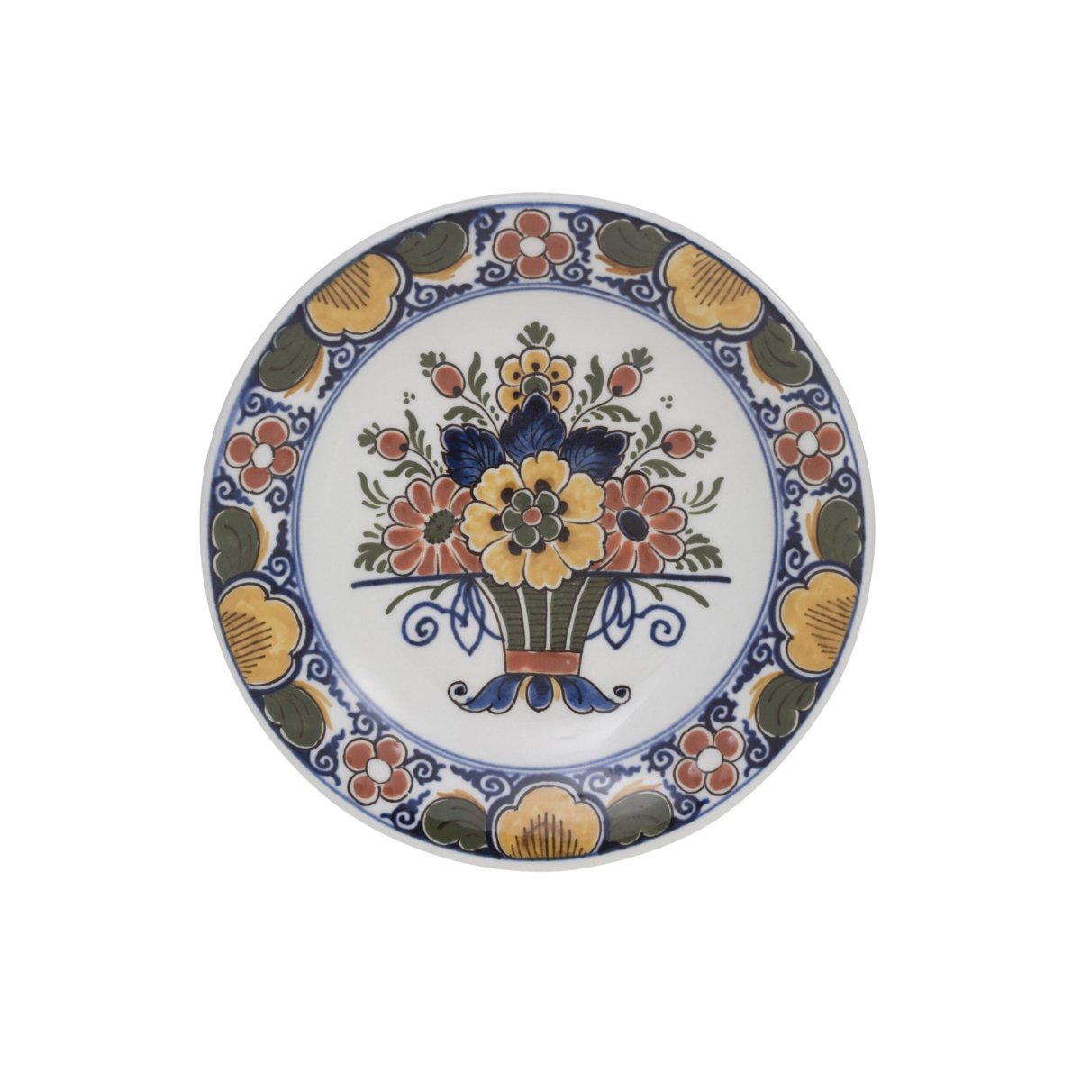 Naast het wereldberoemde Delfts Blauw creëren de meesterschilders van Royal Delft ook de veelkleurige polychrome collectie. Deze decoratiestijl is geïnspireerd op de kleuren die in het Middellandse-Zeegebied worden gebruikt en het zijn deze kleuren die het aardewerk zijn typische karakter geven. In het midden van deze kleine schaal staat een kleurrijke bloemenmand afgebeeld.
