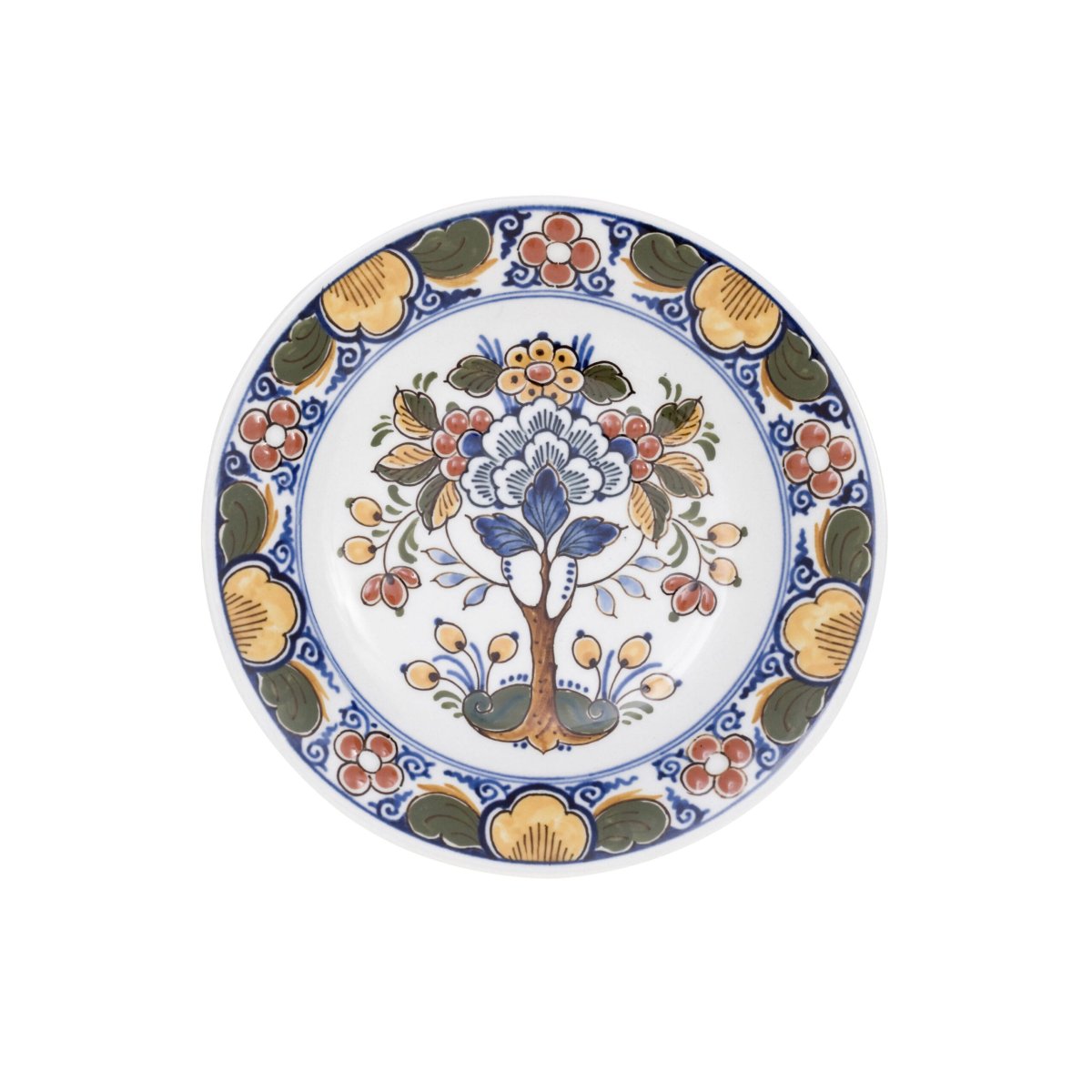 Naast het wereldberoemde Delfts Blauw creëren de meesterschilders van Royal Delft ook de veelkleurige polychrome collectie. Deze decoratiestijl is geïnspireerd op de kleuren die in het Middellandse-Zeegebied worden gebruikt en het zijn deze kleuren die het aardewerk zijn typische karakter geven. Dit bord is versierd met een boom vol bloemen.