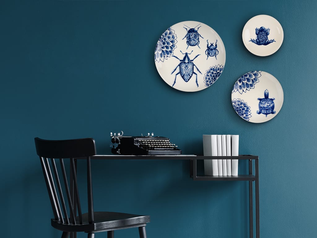 De Wunderkammer-collectie is geïnspireerd op rariteitenkabinetten die in de 17e eeuw door de rijken der aarde in hun huizen werden gepresenteerd. De afbeeldingen van de collectie zijn aangebracht met behulp van de transfertechniek. De drie kevers op dit grote Delfts Blauwe bord worden omring door bloemen.