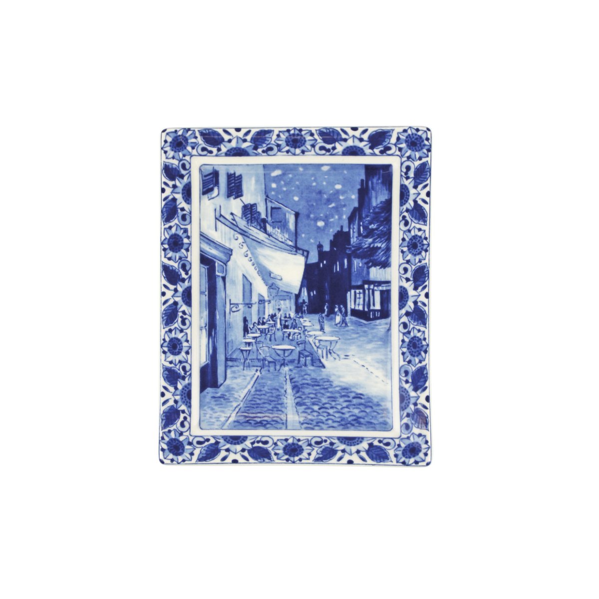 Bij Royal Delft hebben we een van de bekendste werken van Van Gogh vertaald naar een applique in Delfts Blauw. In de applique zijn de verschillende tinten Delfts Blauw te zien. In de rand van de applique zien we grafische zonnebloemen.
