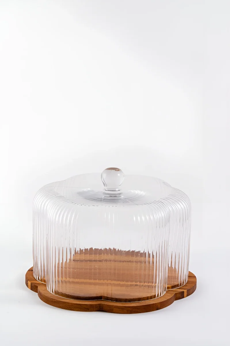 Luxe glazen stolp op een decoratief onderbord van acaciahout. Perfect voor het stijlvol presenteren van gebak, kaas of decoratie.