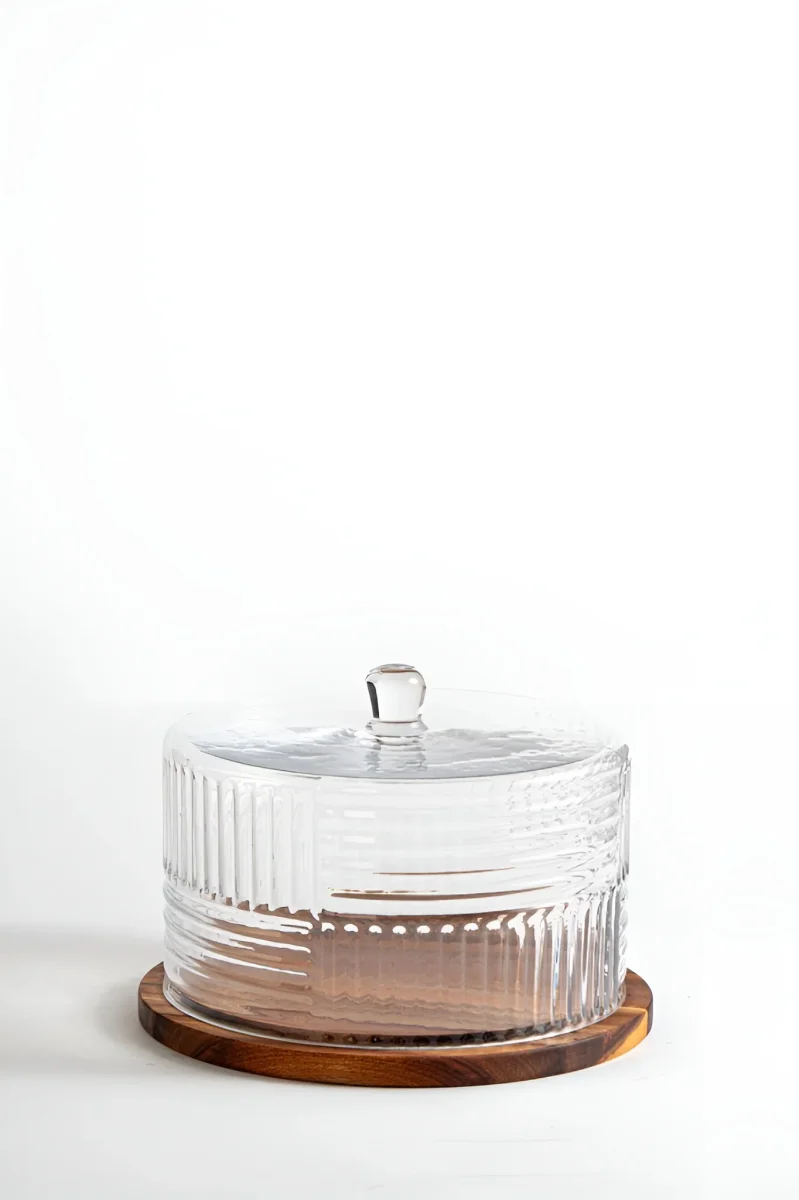 Deze stijlvolle glazen stolp met een acaciahouten onderbord is perfect voor het presenteren en vers houden van taarten, kazen of andere lekkernijen. De stolp is gemaakt van helder, geribbeld glas met een handige knop bovenop, waardoor hij eenvoudig op te tillen is. De warme uitstraling van het duurzame acaciahout vormt een prachtig contrast met het glas en maakt dit stuk een elegante aanvulling op elke tafel of keuken.