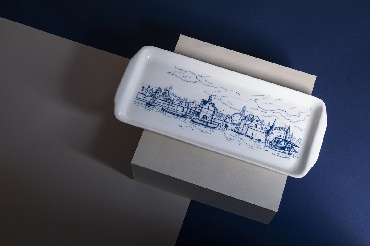 Cakeschaal met prachtige decoratie van ‘Gezicht op Delft’, een van de beroemdste schilderijen van Johannes Vermeer. Ideaal voor het serveren van hapjes, cake of andere lekkernijen.