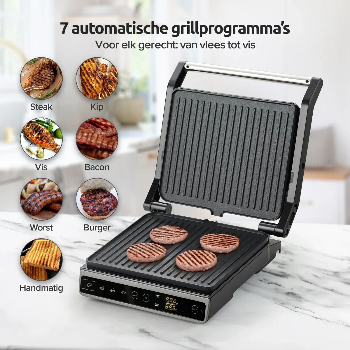 - 7 automatische programma’s: druk op de knop en de grill stelt zelf de juiste tijd en temperatuur in voor o.a. steak, vis of panini’s.