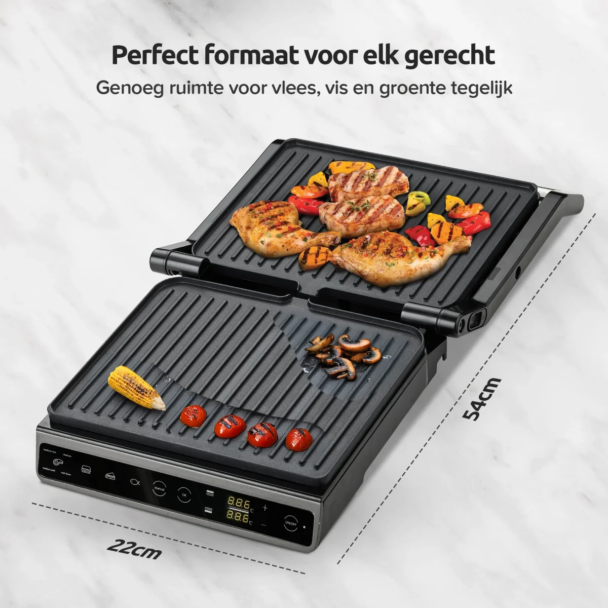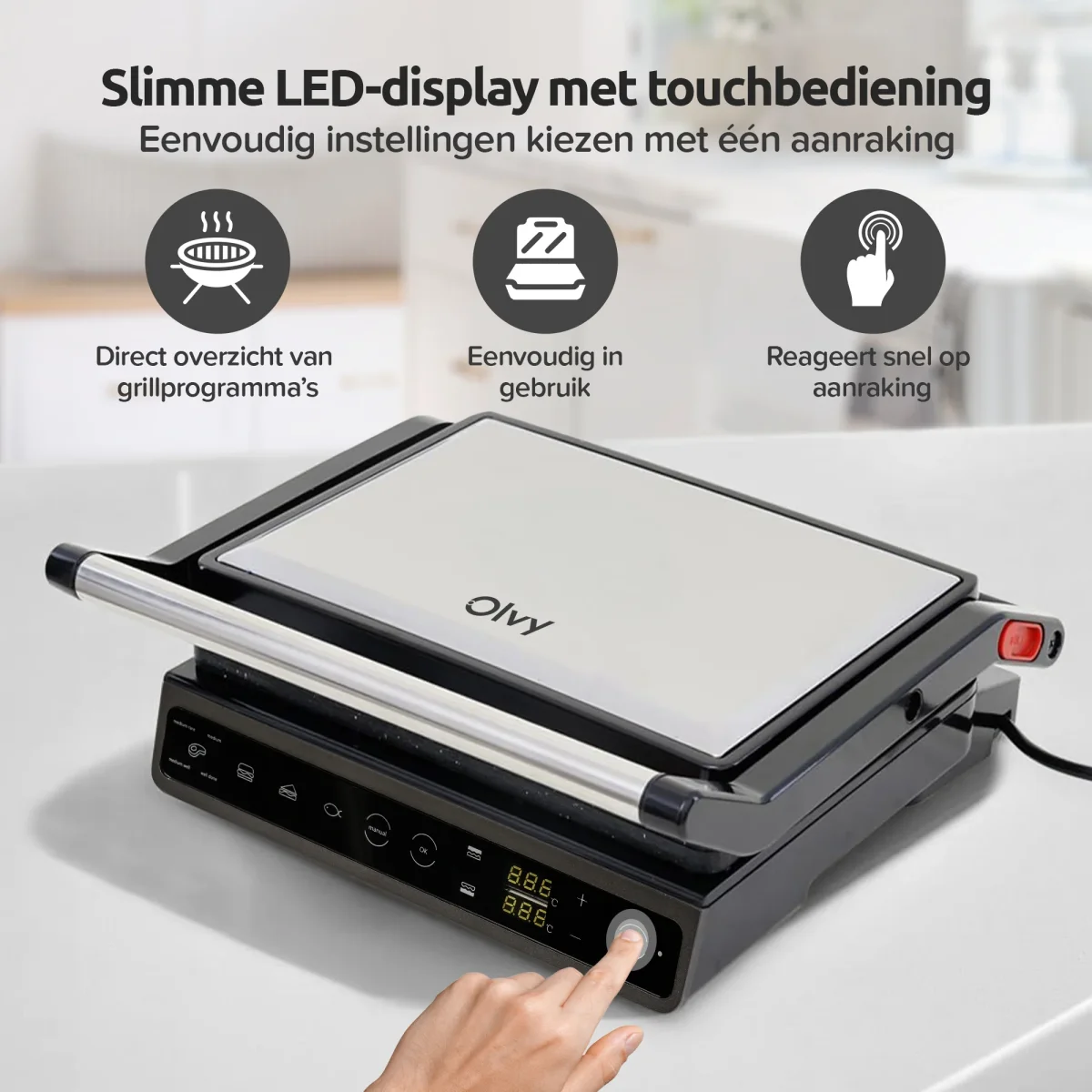 Met de Olvy Contactgrill haal je een krachtig grill apparaat in huis dat alles kan: van sappige steaks en gegrilde groenten tot panini’s en tosti’s. Dankzij het touch screen display en 7 automatische programma’s krijg je altijd het perfecte resultaat. Klap hem open tot 180° en geniet van extra grillruimte voor het hele gezin.