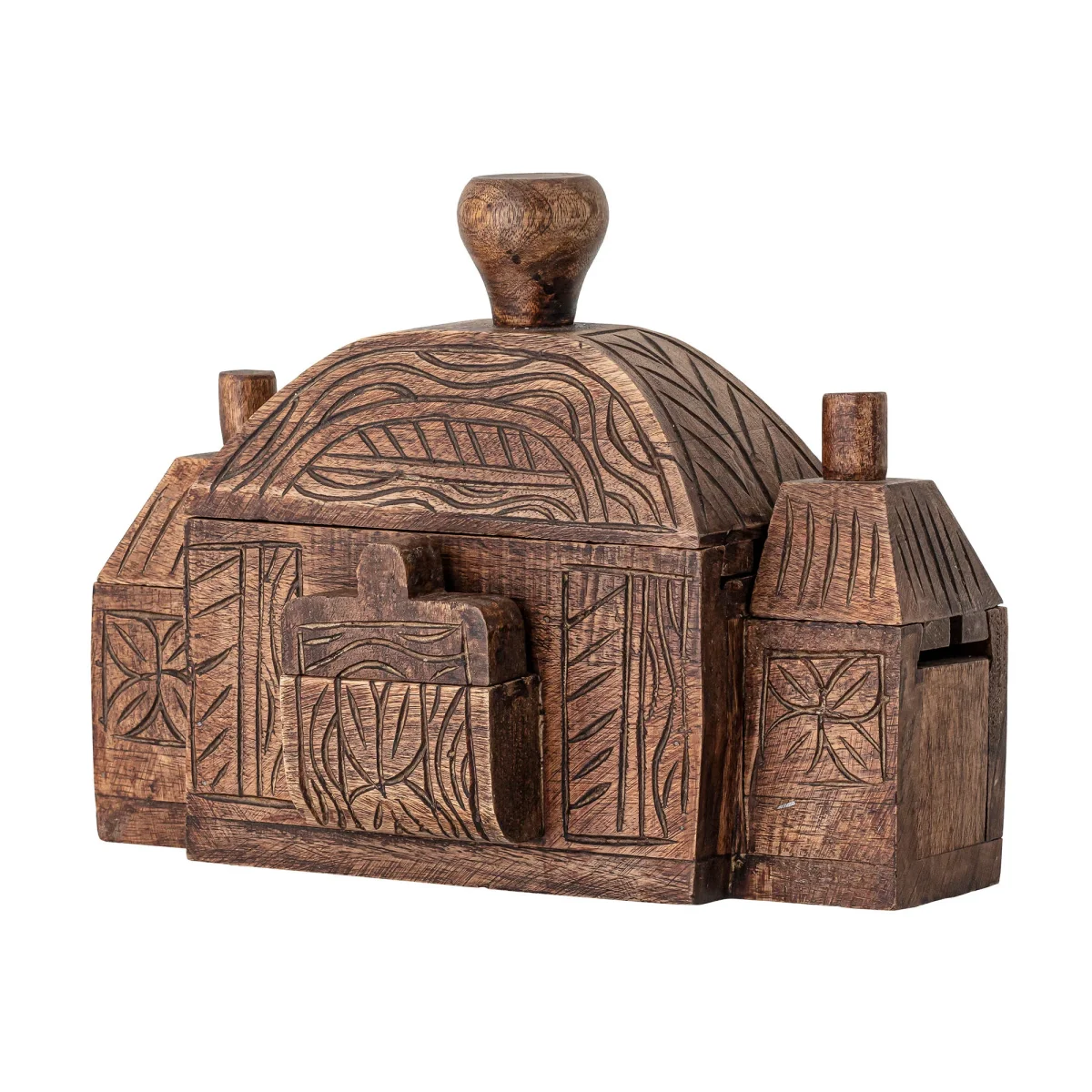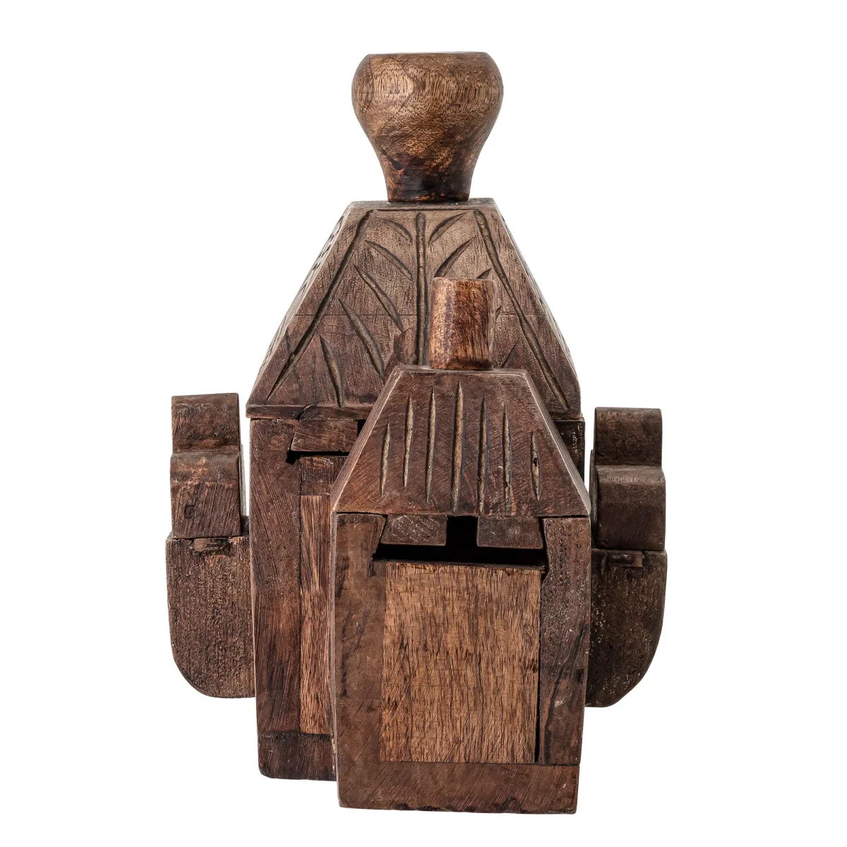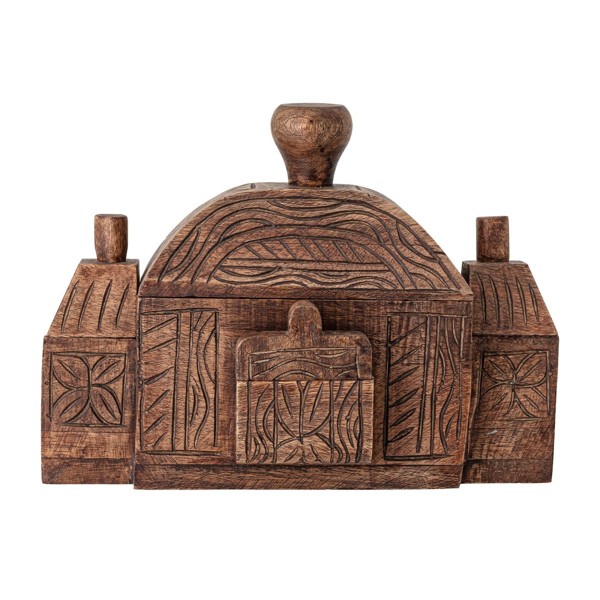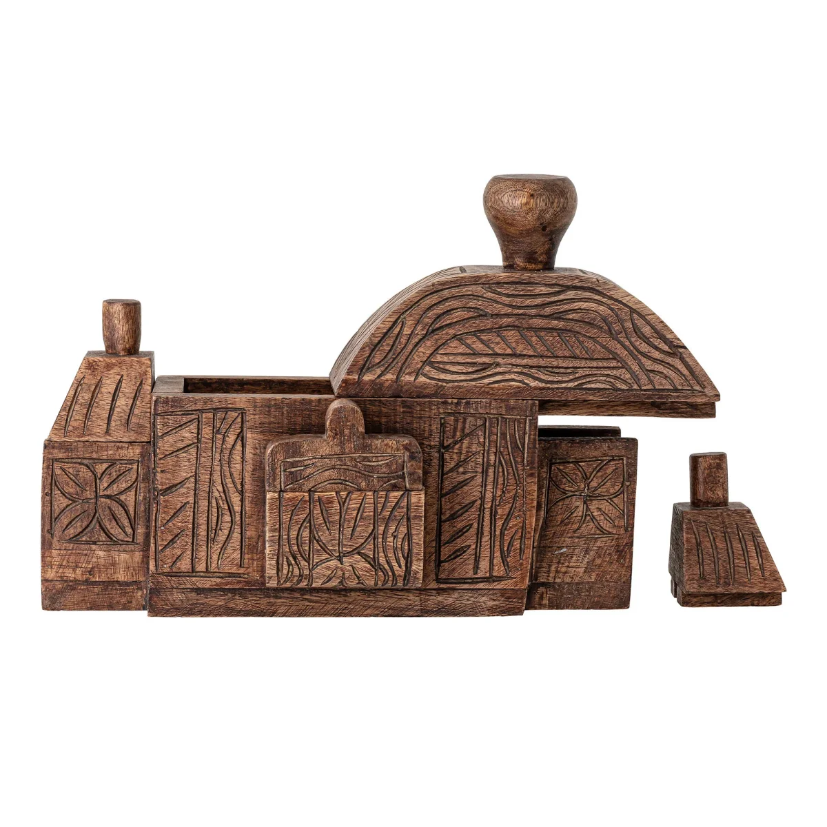 Decoratieve opbergdoos van mangohout met veel verborgen kamers.