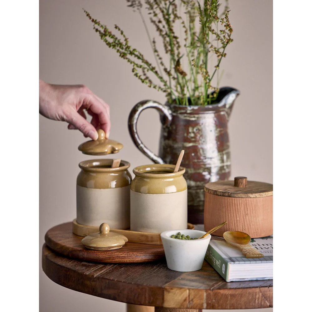 De Elaf Pot Met Deksel & Lepel van Creative Collection is een set van 2 aardewerken potten op een klein houten dienblad. De potten zijn gemaakt van steengoed in prachtige groene en natuurkleuren. Ze zijn mooi en gezellig om etenswaren in te bewaren. Vul de potjes met bloem, suiker, honing of wat je maar nodig hebt om te bewaren. Wordt geleverd met 2 kleine houten lepels.