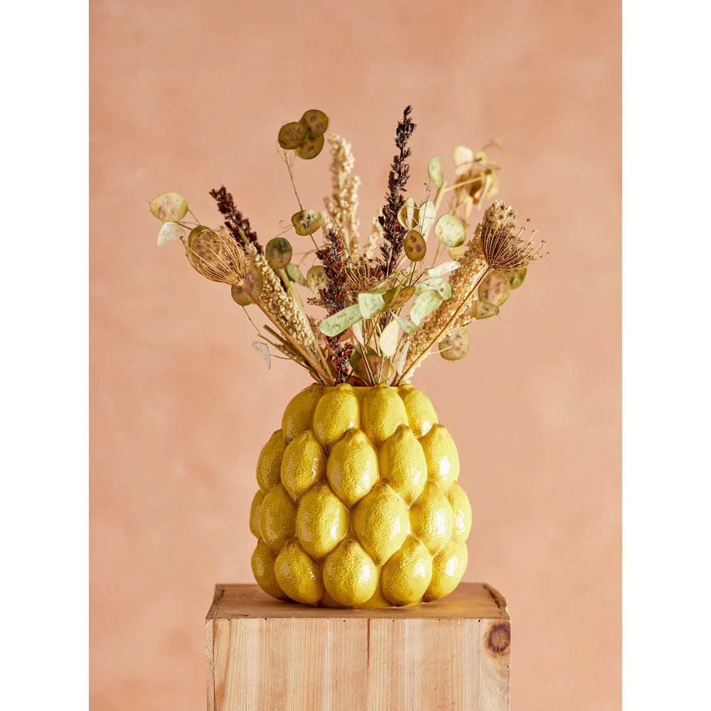 De Limone Vaas van Creative Collection is gemaakt van steengoed in een warmgele kleur. Versierd met mooie citroenen. Gebruik hem voor verse bloemen en als middelpunt in de woonkamer voor een eye-catcher. Omdat elke vaas met de hand wordt gedecoreerd, kunnen er kleurvariaties optreden.