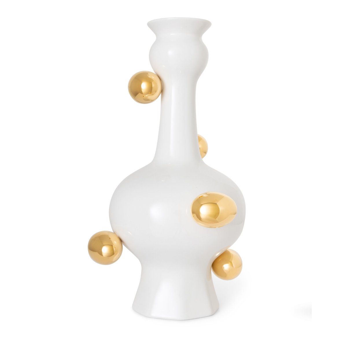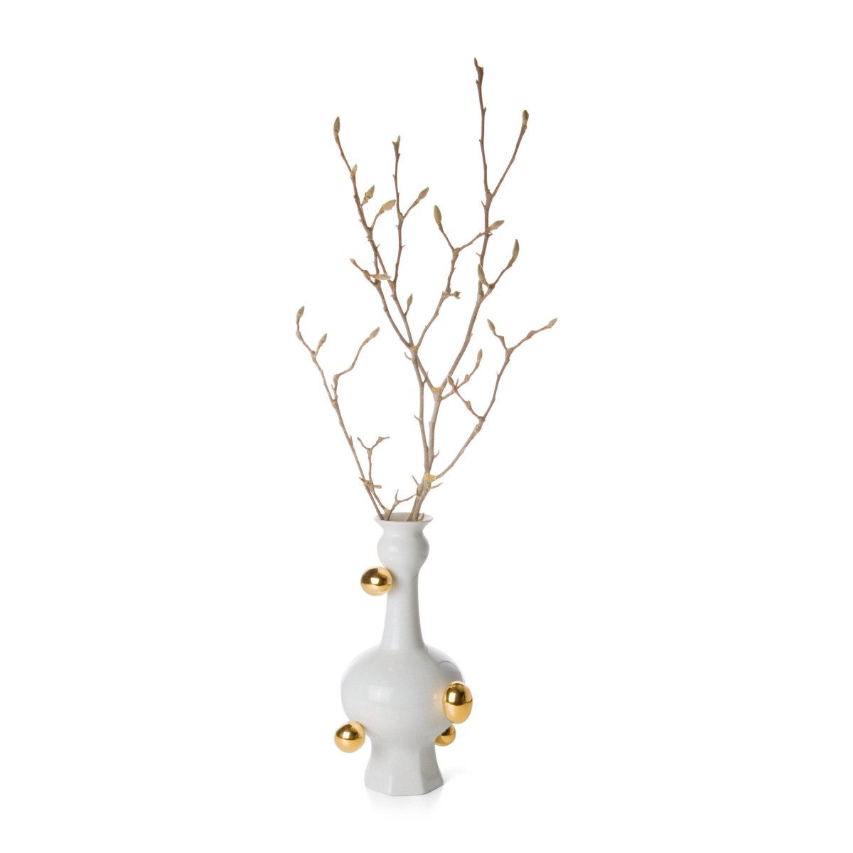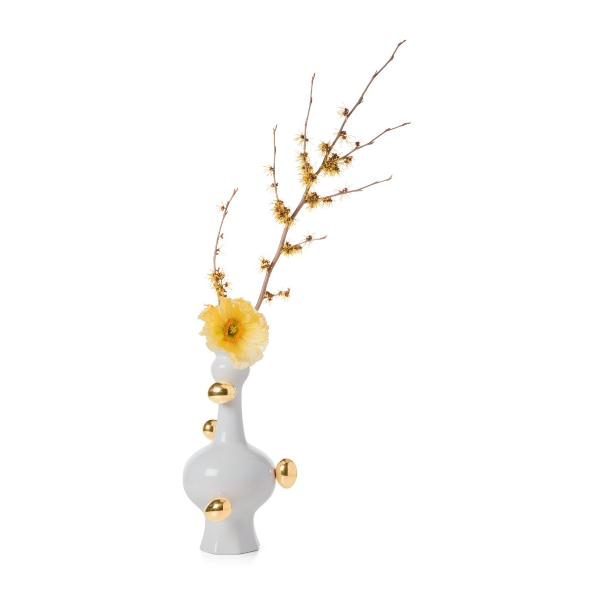Deze lange vaas met gouden eieren is ontworpen door Marcel Wanders en onderdeel van de Moooi x Royal Delft collectie. De collectie bestaat uit interieur objecten met gedurfde vormen, gecombineerd met iconische Delfts Blauwe decoratie. Royal Delft is al geruime tijd fabrikant voor de Delfts Blauwe vazencollectie van Moooi. De vazen uit de Moooi x Royal Delft collectie worden met de handgemaakt in het atelier in Delft, met oog voor detail en hoge kwaliteit.