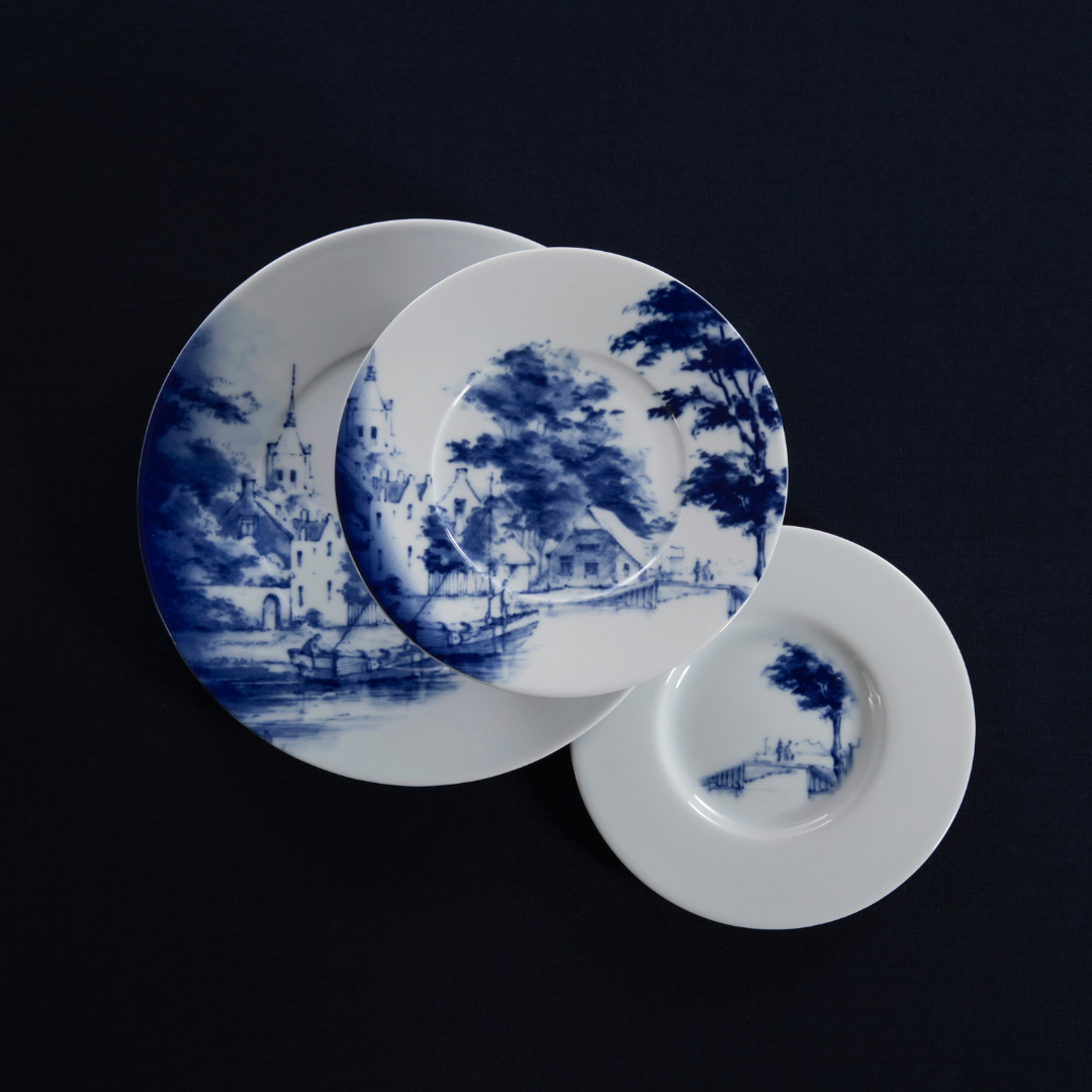 Het 10-delige servies Dutch Dawn vormt in zijn geheel een prachtig Delfts Blauw kunstwerk. Ieder item geeft zijn eigen unieke stukje van het landschap weer. Waar op het dinerbord en het pastabord de natuur centraal staat, is op het dessert bord het stadse gedeelte van de landschapsschildering te zien en wordt de mok omarmd door de dauw in het graslandschap. Het wegvagen van het landschap geeft ruimte aan de creativiteit van de chef, in combinatie met de ton-sur-ton decoratie op het onderbord en de grote schaal, benadrukt de mystiek rondom de Hollandse ochtenden.