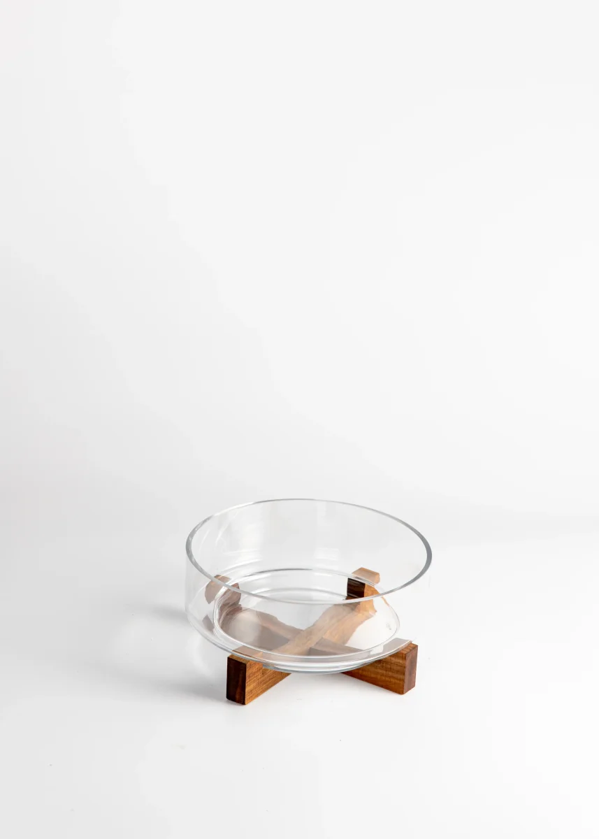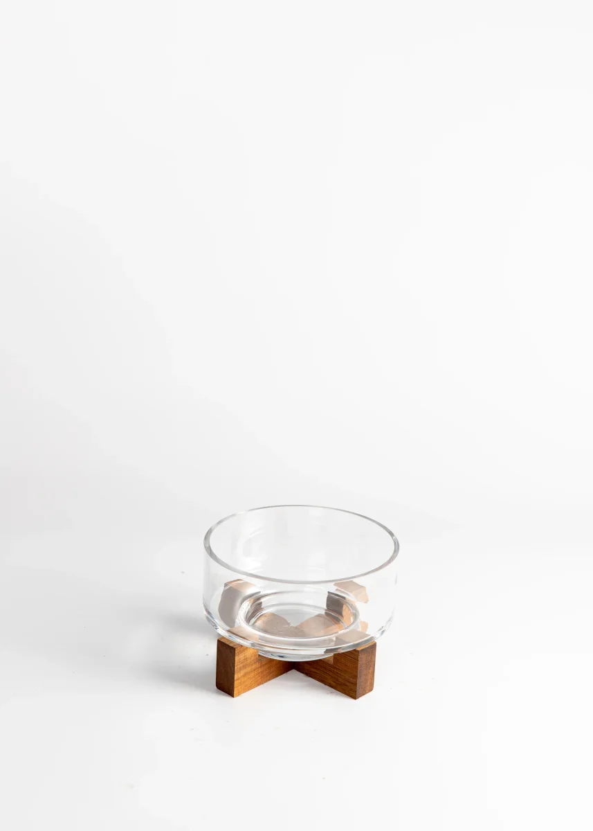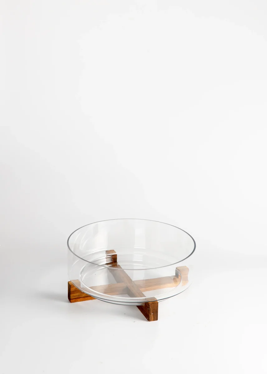 Glazen serveerschaal op acaciahouten standaard – Ø 28 cm