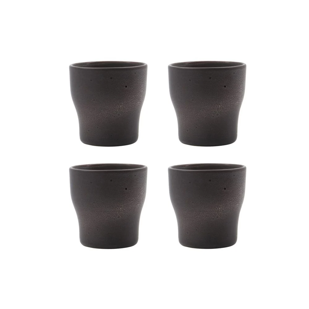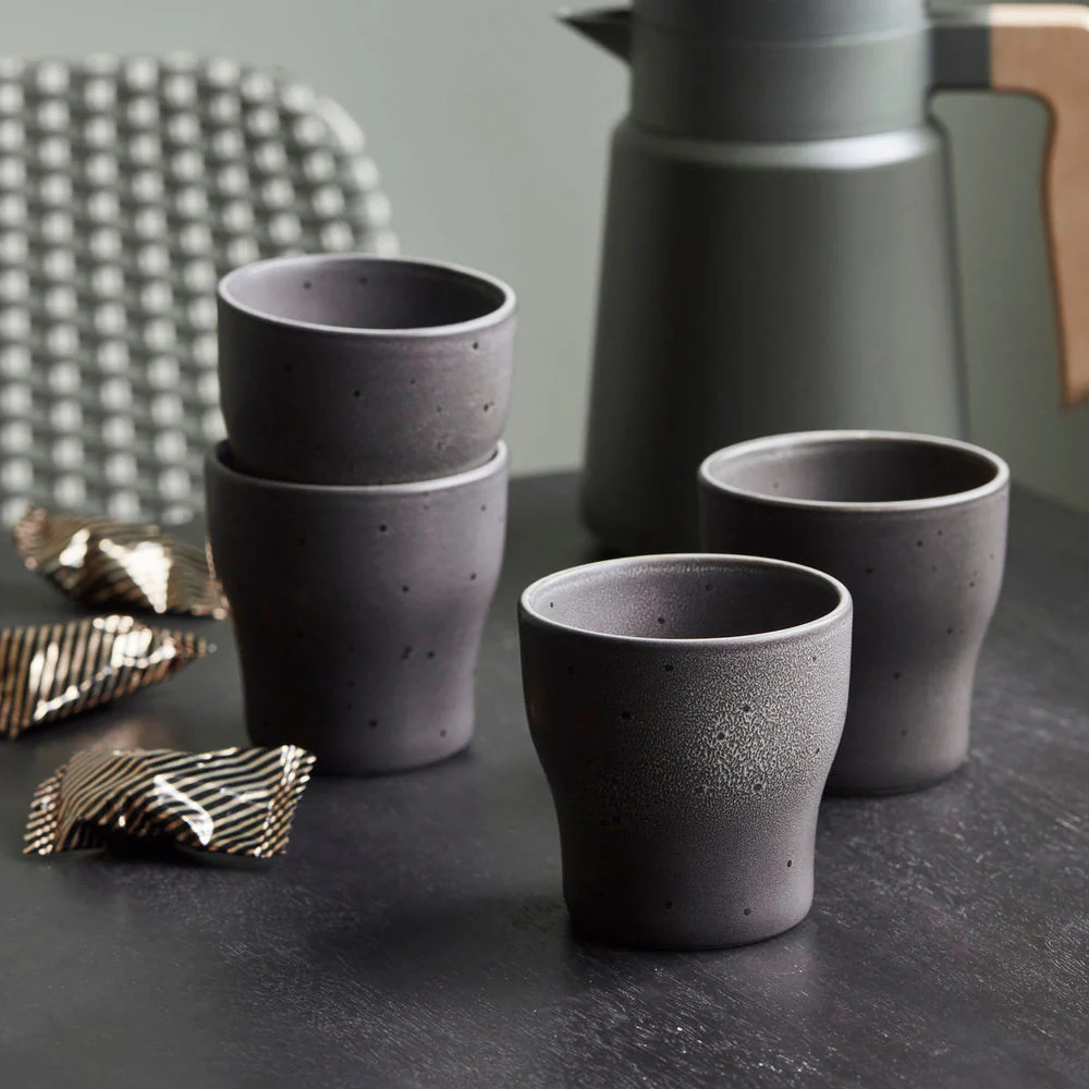 Deze set van 4 thermosmokken heet Liss en heeft een dubbelwandig ontwerp waardoor je thee en koffie langer warm blijven. De aardewerken mokken van House Doctor zijn afgewerkt met een donkergrijs glazuur met tonale stippen die glans toevoegen wanneer het licht op het oppervlak valt. In plaats van een handvat hebben de mokken een taps toelopende vorm, waardoor je ze gemakkelijk op kunt pakken en comfortabel vast kunt houden. Gebruik de mokken wanneer je gasten ontvangt, voor een kop thee in de avond of een welverdiende pauze in de namiddag. Of op elk ander moment. Ze zijn de perfecte keuze voor gelegenheden die vragen om wat nonchalante elegantie.