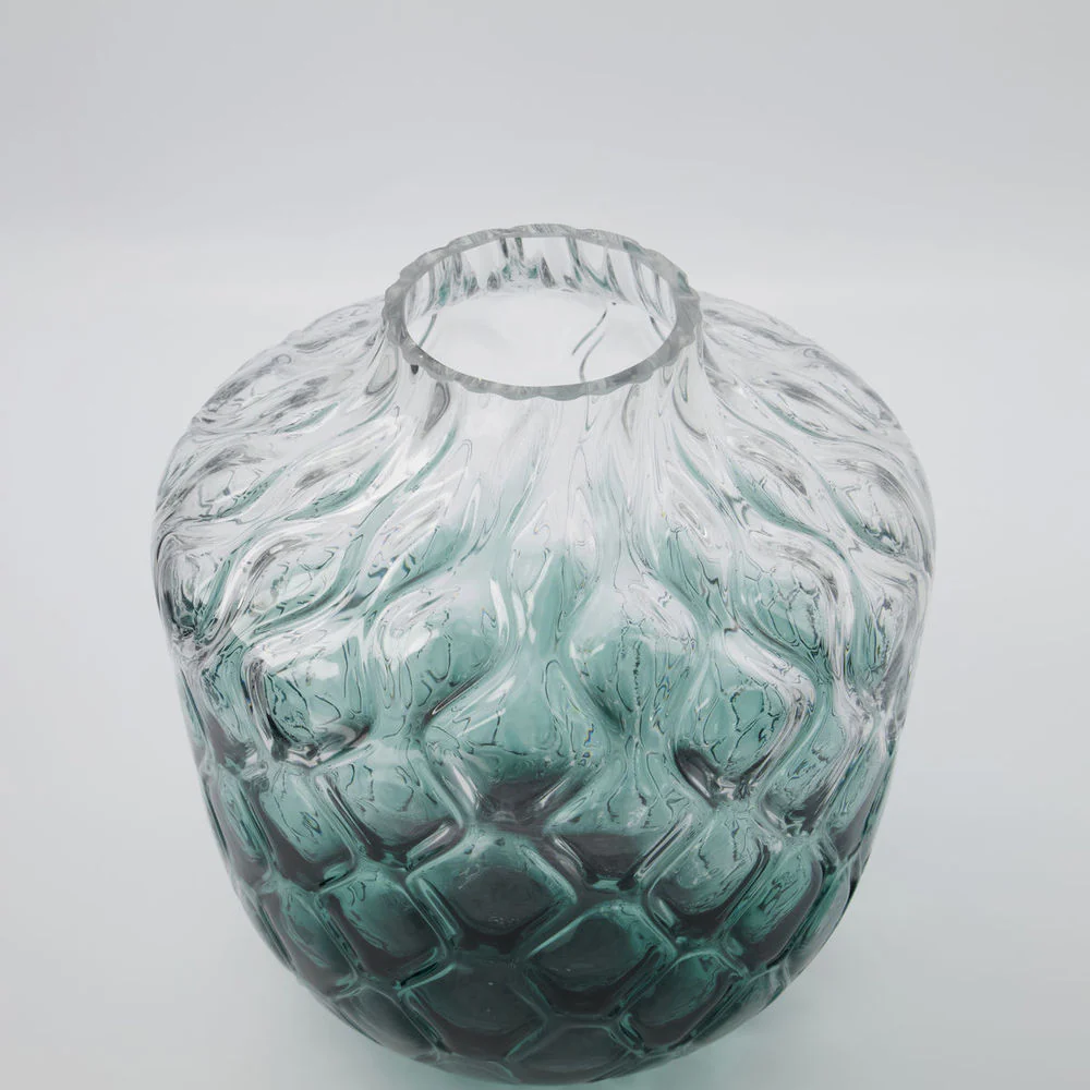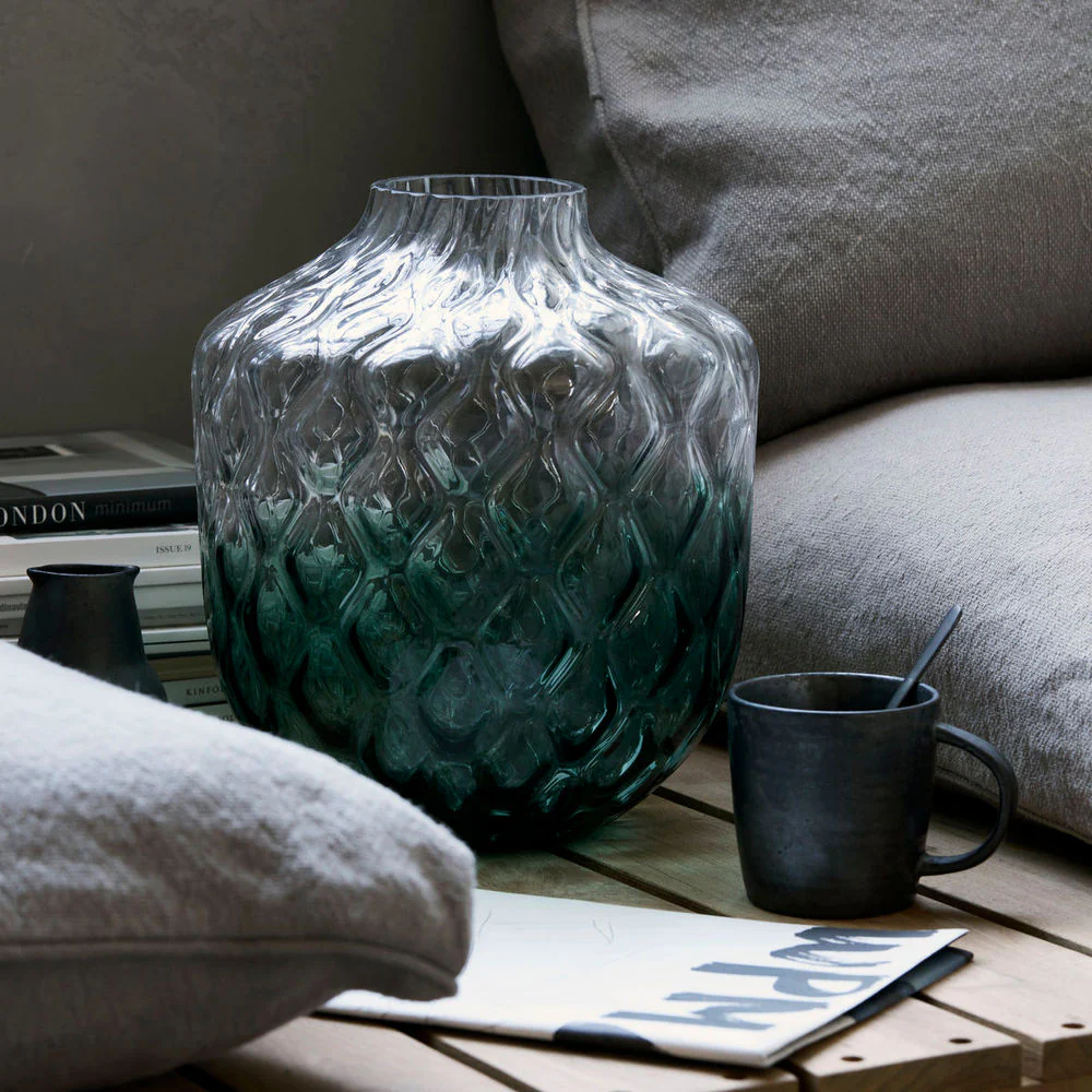 Deze Art Deco vaas van House Doctor is een perfect voorbeeld van hoe vorm, materiaal en details prachtig samenkomen. Het vakmanschap is zichtbaar in het zorgvuldige, mondgeblazen glas met een groen verloop dat naar beneden toe donkerder wordt. Met zijn geometrische reliëfpatroon straalt deze vaas kracht en volume uit. Groot genoeg om de aandacht te trekken, maar niet te groot om andere voorwerpen te overtreffen. Plaats er verse bloemen in en laat het een blikvanger op je eettafel of bijzettafel zijn.