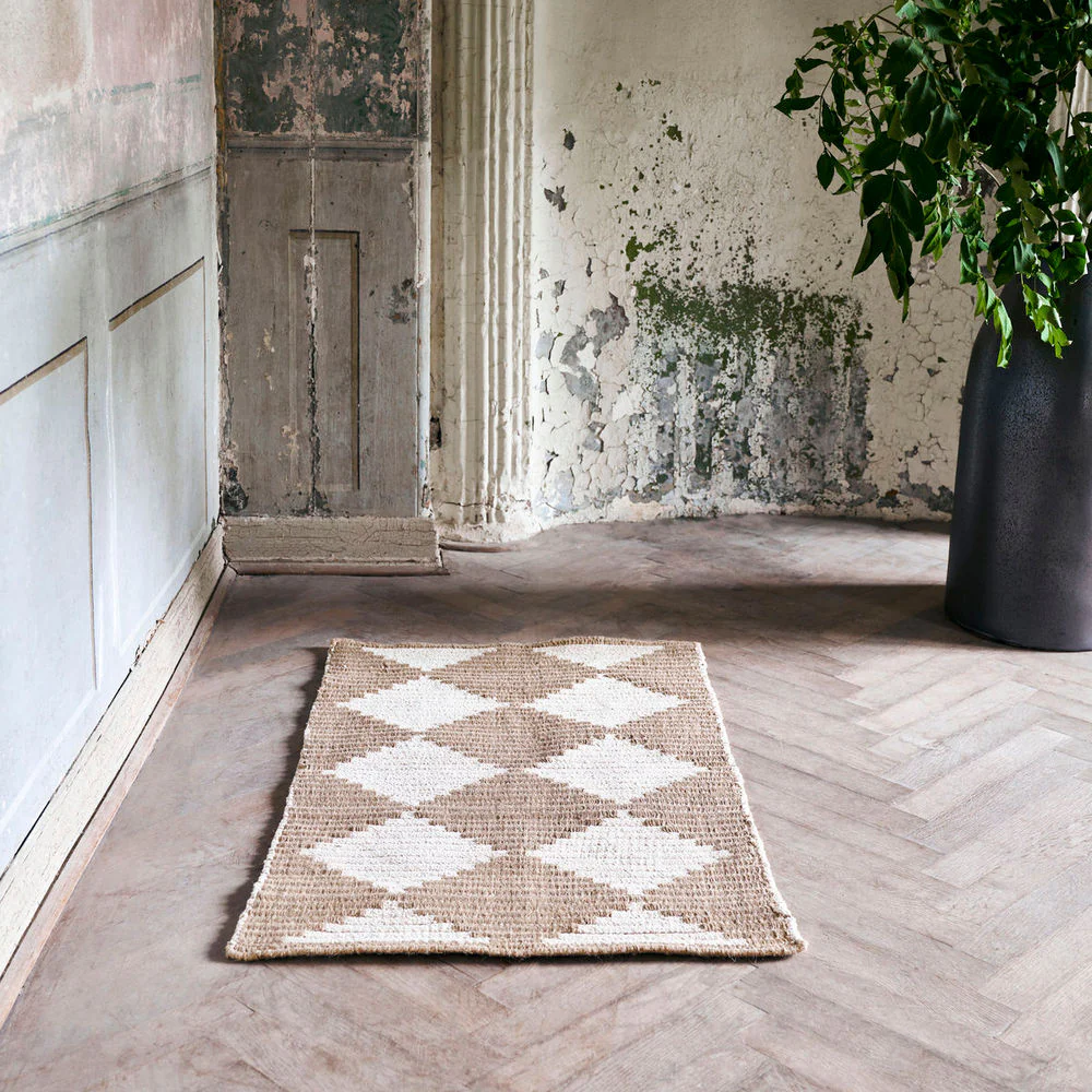 Het kleine Dry vloerkleed van House Doctor geeft je huis een snelle update. De combinatie van een ruitpatroon in neutrale en lange franjes voegen een informeel detail en zacht accent aan elke kamer toe. Het vloerkleed is gemaakt van jute en katoen, waardoor het niet aan duurzaamheid en zachtheid inboet. Met zijn kleine formaat is Dry ideaal voor je slaapkamer, gang, onder een kleine salontafel of in je thuiskantoor. Het patroon is een welkome aanvulling op een minimalistische inrichting of een interieur met aardetinten.