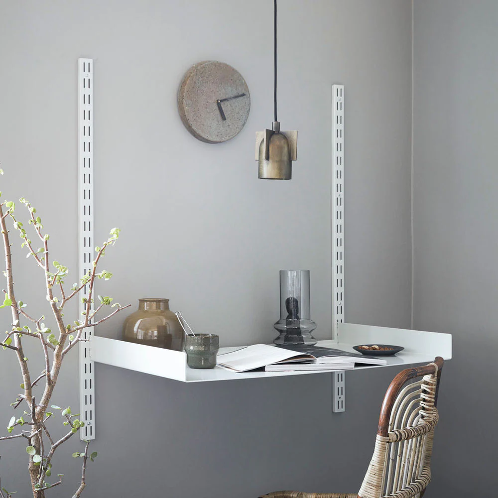 Wil je je thuiskantoor vernieuwen of ben je op zoek naar een slimme bureauoplossing? Fari is precies wat je zoekt. Het wandbureau is ontworpen door House Doctor en kan gecombineerd worden met de open kast uit hetzelfde assortiment. Monteer de twee beugels simpelweg aan de muur en plaats het bureau op de gewenste hoogte. De grijze coating geeft het stalen materiaal en het minimalistische ontwerp een prachtige glans. Als je een functionele oplossing nodig hebt, heb je haar gevonden. Ideaal voor kleine werkplekken en woonkamers omdat het bureau geen vloeroppervlak in beslag neemt.