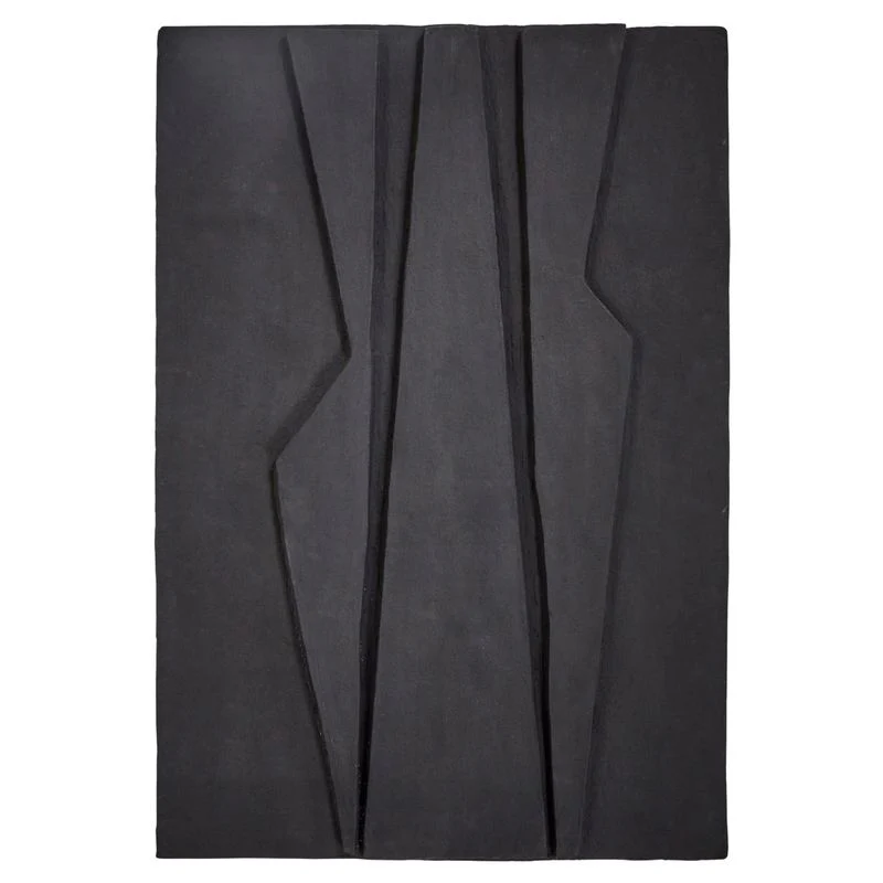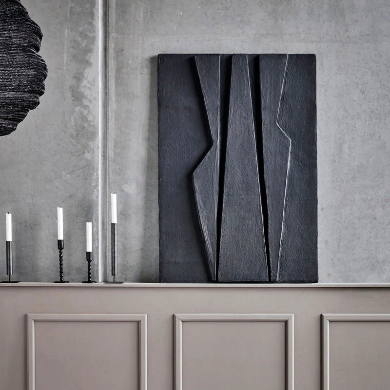 Deze handgemaakte muurkunst, gemaakt van gerecycled katoen met een matzwarte afwerking, toont unieke onvolkomenheden die de ambachtelijke oorsprong ervan benadrukken. Het integreert moeiteloos in zowel hedendaagse als creatief gethematiseerde ruimtes en biedt stijl en een toewijding aan duurzaamheid.