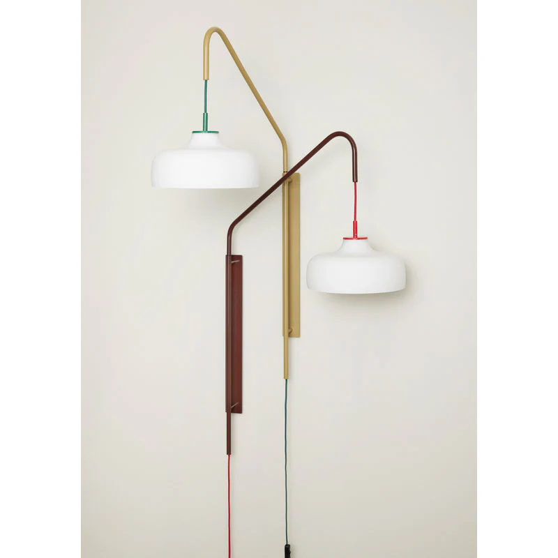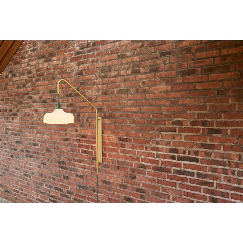 Grote wandlamp van kakikleurig metaal met een donkergroen stoffen snoer en een zacht afgeronde opaalglazen kap.