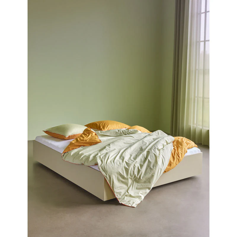 Groen en bruin omkeerbaar beddengoed met rode biezen en ritssluiting. 100% STANDARD 100 By Oeko-Tex® perkalkatoen.