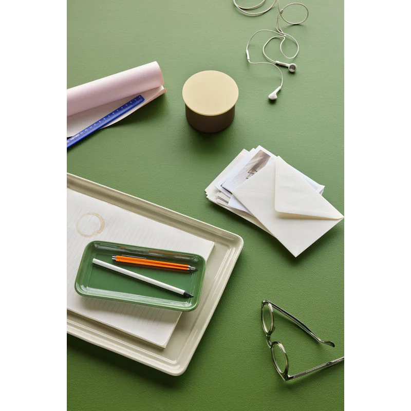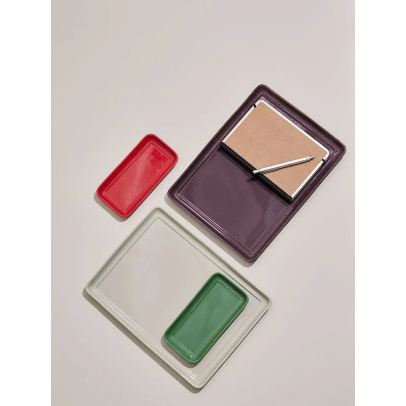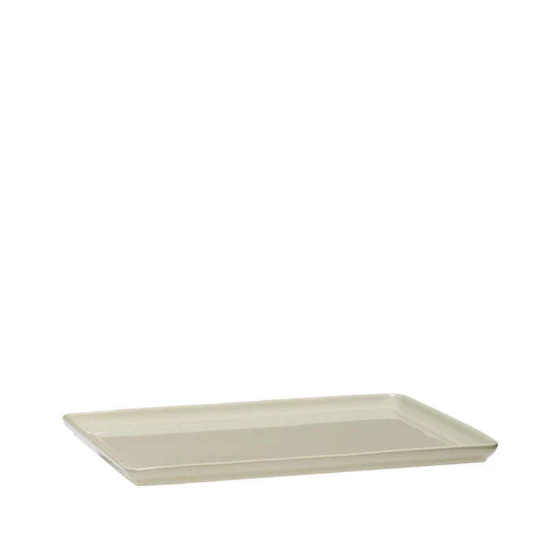 Groot zandkleurig keramieken dienblad met een kleiner groen keramieken dienblad.