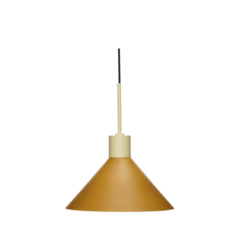 Veelkleurige hanglamp met bruine kap en zandkleurige fitting.