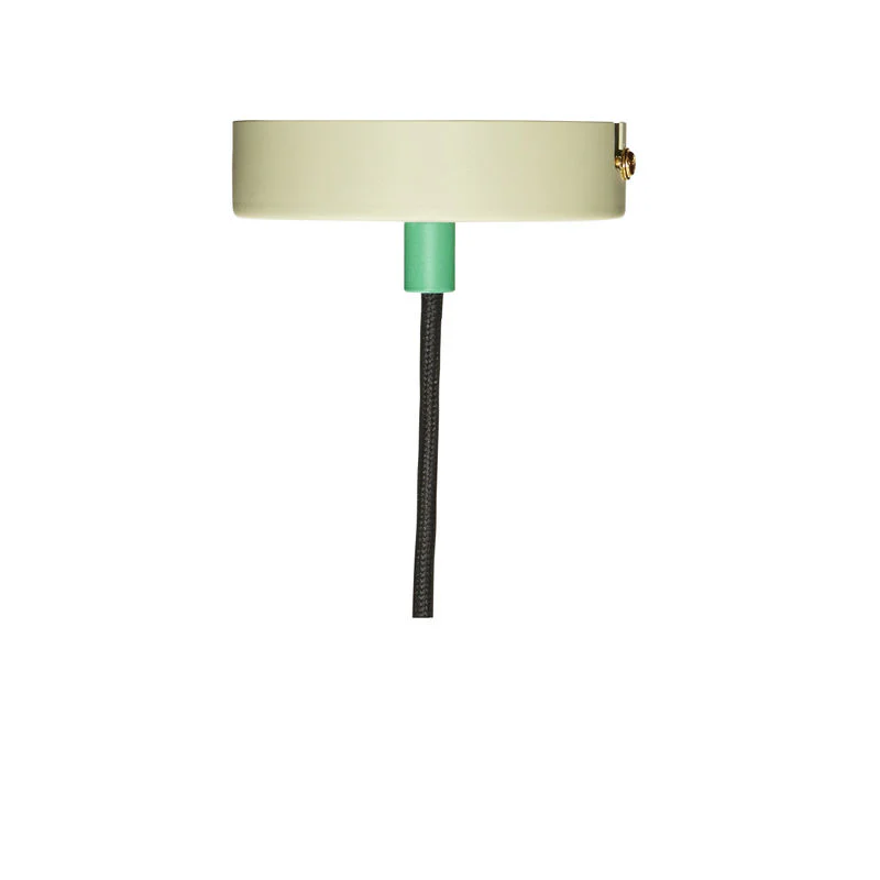 Veelkleurige hanglamp met zandkleurige kap en een groene, oranje en bruine fitting.