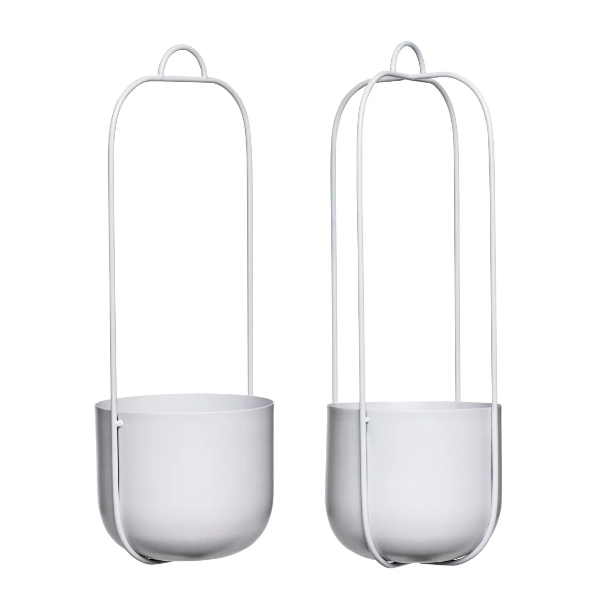 Grijskleurige hangpotten van gepoedercoat ijzer. Set van twee