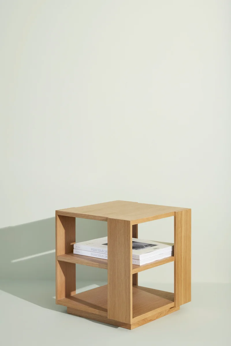 Kleine vierkante bijzettafel met open planken in eikenfineer. Gemaakt van FSC®-gecertificeerd hout.