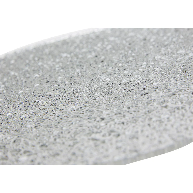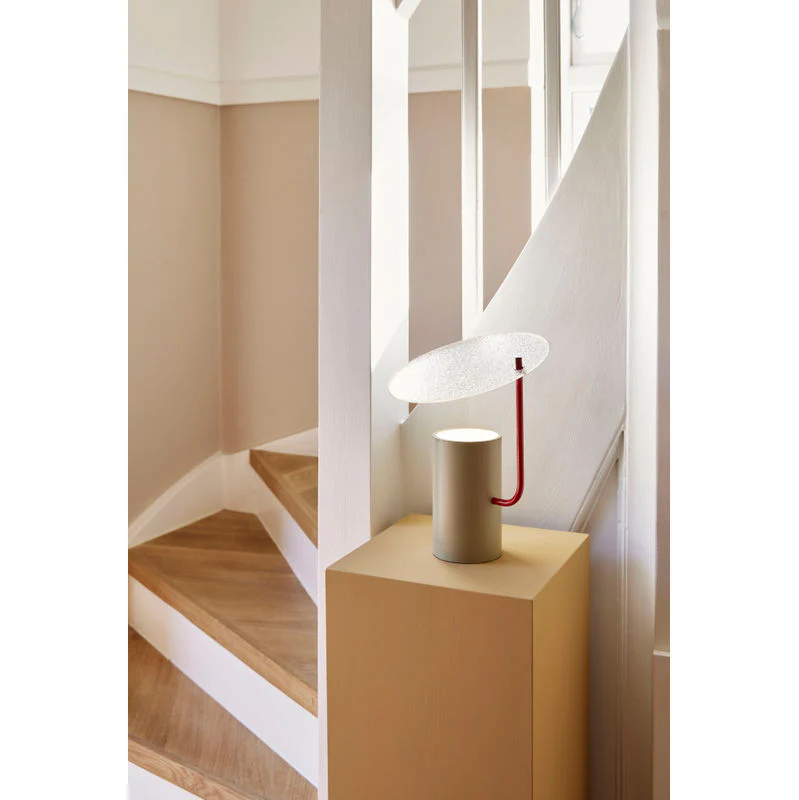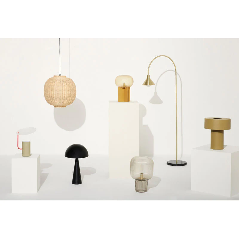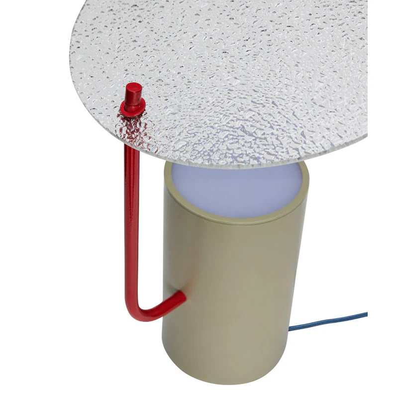Tafellamp met ronde getextureerde glazen kap, kakikleurige voet en benzinekleurig draad.