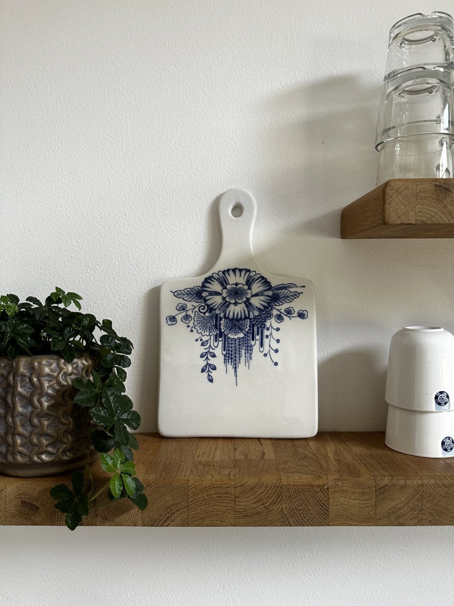 Delfts Blauwe kaasplank met bloemen afbeelding. Op dit grotere kaasplankje staat een sierlijk bloemen patroon. Perfect om de borrel nog een stukje gezelliger te maken. Koop hem samen met de kleinere bloemen of de molen variant.
