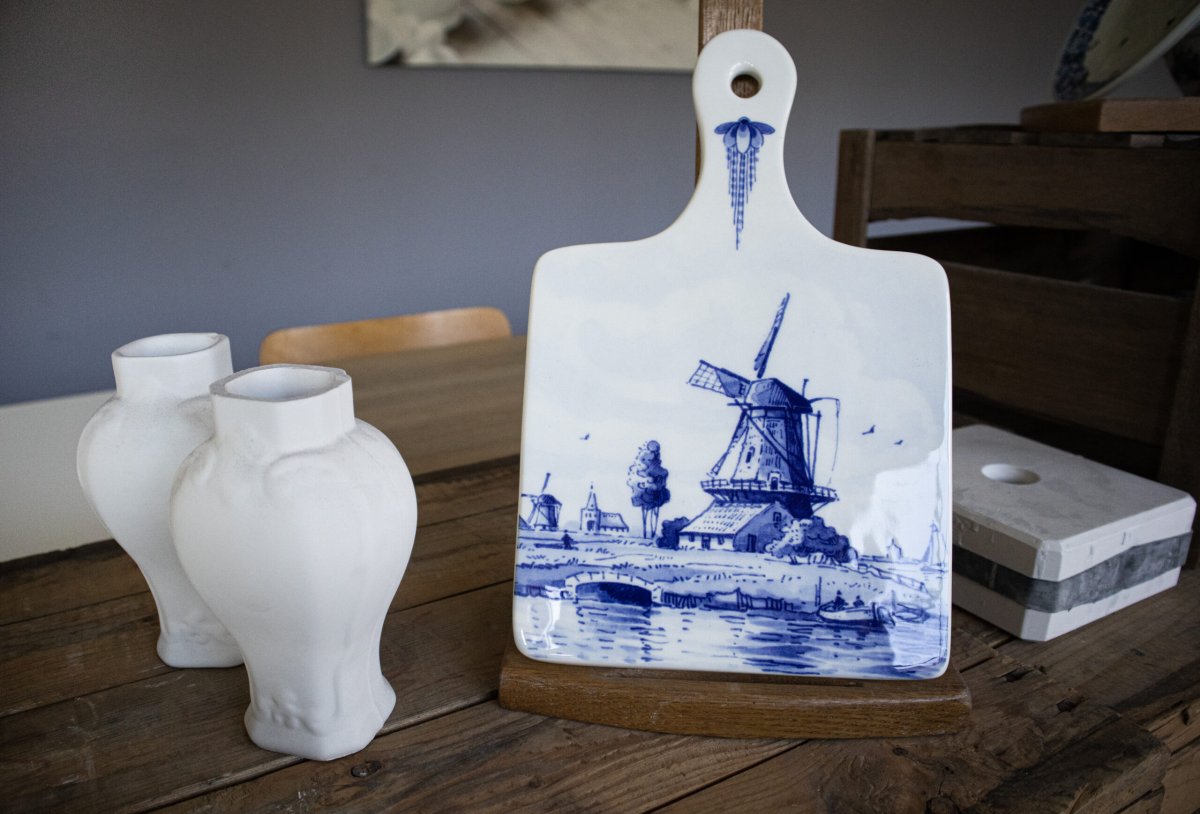 Delfts Blauwe kaasplank met molen afbeelding. Op dit grotere kaasplankje staat een traditioneel Hollandse molen op een prachtig landschap. Perfect om de borrel nog een stukje gezelliger te maken. Koop hem samen met de kleinere molen of de bloemen variant.