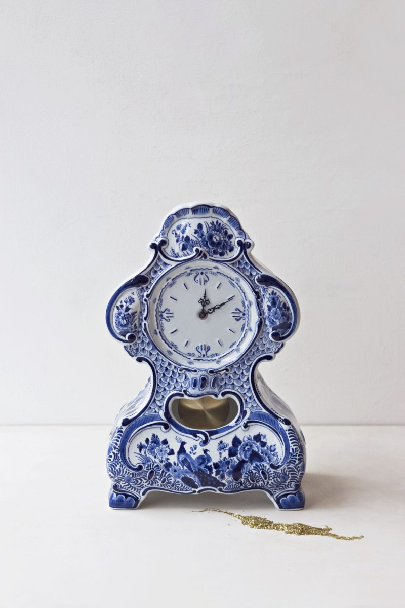 In de periode waarin klokken zeer waardevol waren, bevond zich op de plek waar nu het uurwerk is een ronde opening, waarin een zakhorloge kon worden geplaatst. Zo werd het decoratieve object tijdelijk omgevormd tot een functionele klok. De eigentijdse uiterst elegante klok is versierd met bloemen en toont ook de karakteristieke vogel van Royal Delft. De uuraanduiding wordt met kleine rechte streepjes weergegeven, passend bij de ranke wijzers. De slinger is door de uitsparing in het keramiek goed zichtbaar.