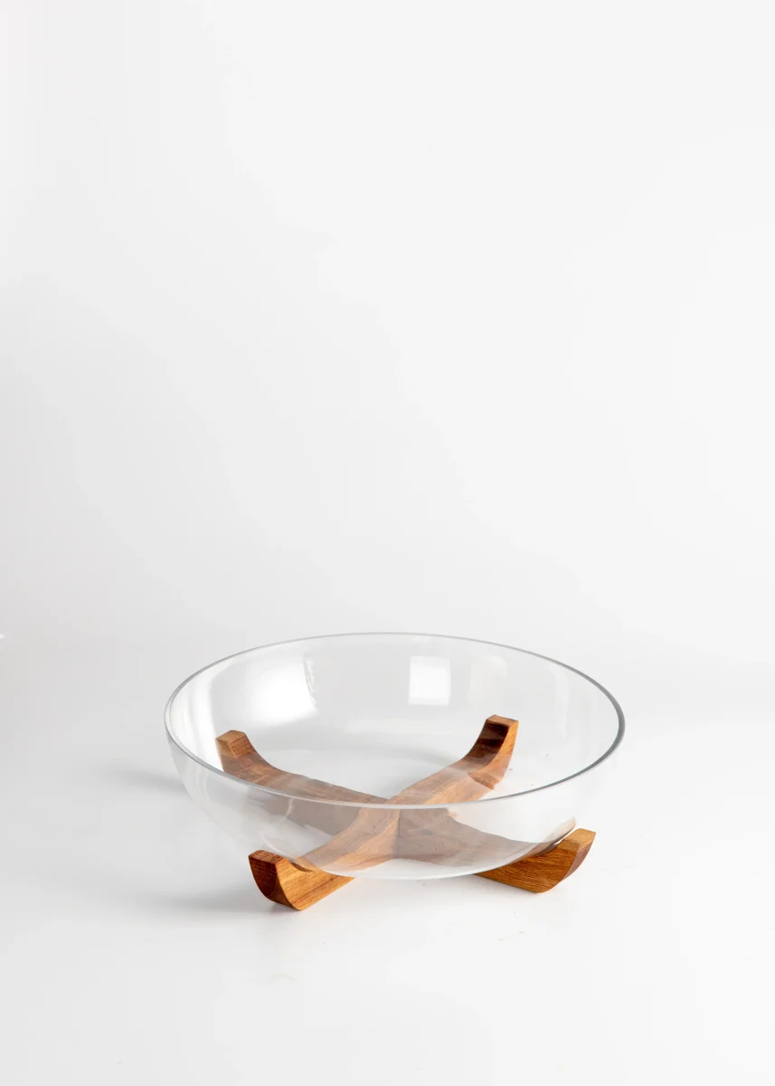 Lage glazen serveerschaal op acaciahouten kruisvoet – Ø 28 cm