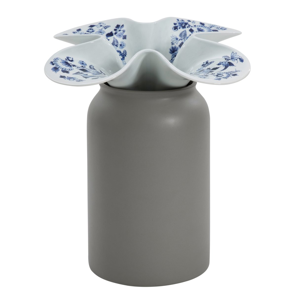 De editie van deze vaas bestaat uit twee losse onderdelen is uitgevoerd in een combinatie van grijs met een Delfts Blauwe kap. De vazen worden volledig met de handgemaakt in het atelier in Delft en zijn allemaal uniek. De kap van deze combinatie is uitgevoerd aan de hand van een transfer techniek.