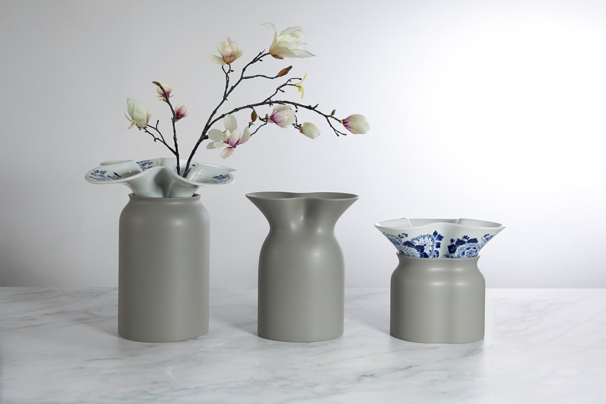 De collectie bestaat uit drie zorgvuldig vormgegeven formaten vazen. De organische contouren van de hals zijn geïnspireerd op de lijnen van bloembladeren en geven iedere vaas een sculpturaal karakter. Binnen de collectie zijn varianten met twee, drie of vier bladeren beschikbaar. De vierbladige vazen bestaan uit twee onderdelen: een strak vormgegeven basis en keramische kelken die op de vaas geplaatst worden. Deze compositie roept het beeld op van een rijk gevulde vaas, een kunstwerk op zichzelf. Hoewel de vazen een krachtig esthetisch statement maken zonder bloemen, zijn ze tevens geschikt om boeketten te dragen. De keramische bloemkelk ondersteunt het boeket op elegante wijze, waardoor vaas en bloemen samen één geheel vormen.