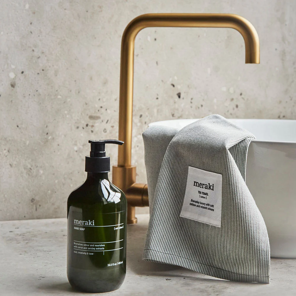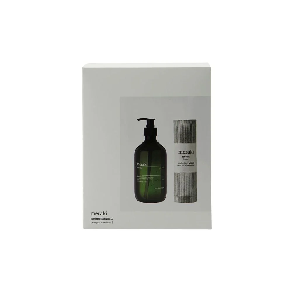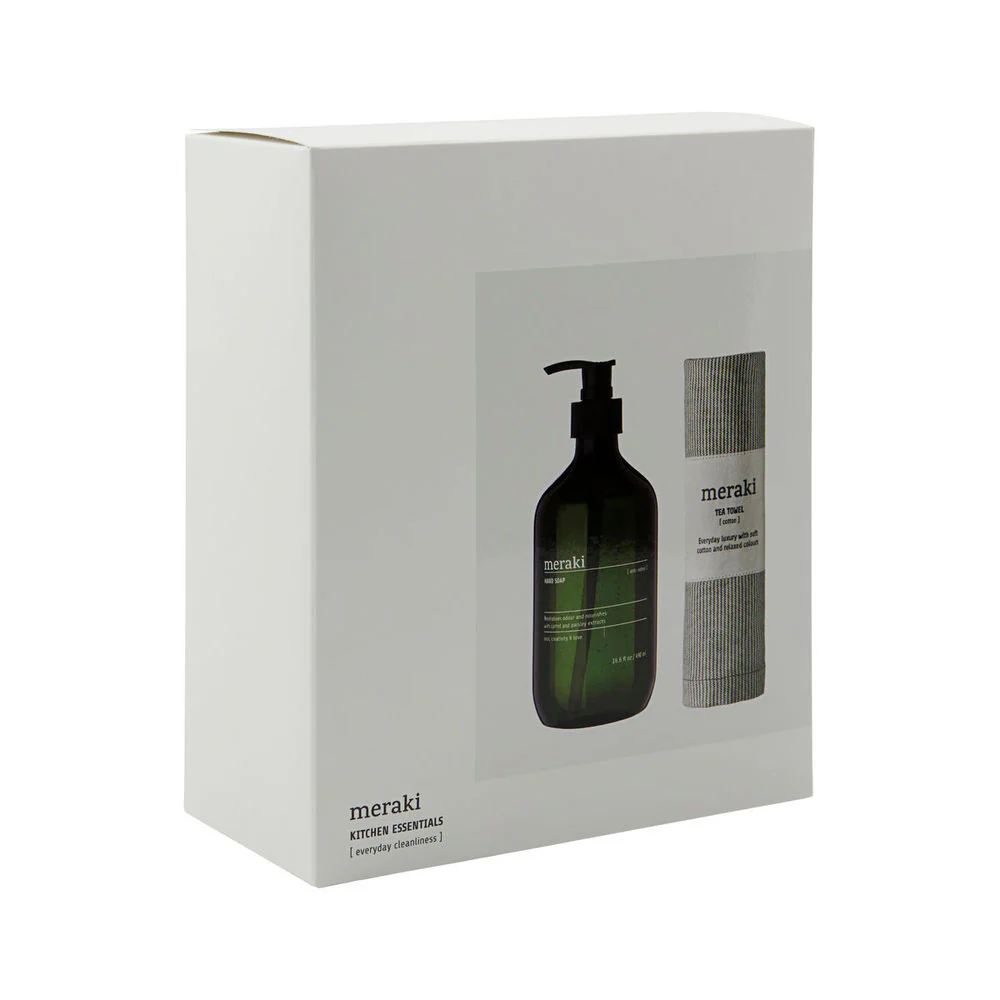 Deze geschenkset van Meraki bestaat uit een essentieel duo voor je keuken. De anti-geur handzeep met een lichte, mint bloemige geur neutraliseert ongewenste geuren van voedsel zoals uien en zeevruchten, terwijl betaïne je handen zacht houdt en de huidbarrière versterkt. De theedoek, gemaakt van OEKO-TEX® 100 gecertificeerd katoen, combineert functionaliteit en een esthetische uitstraling met tijdloze, rustgevende kleuren.